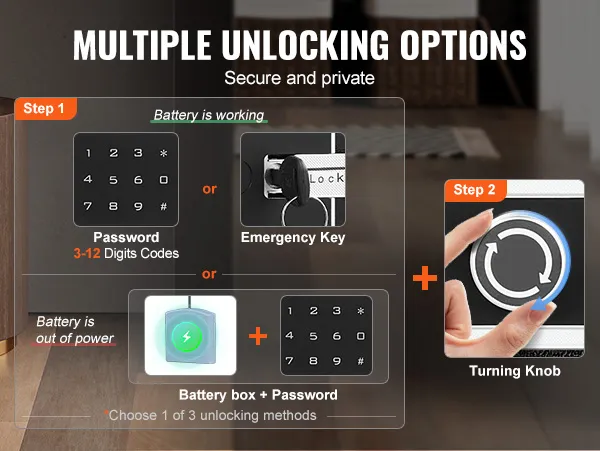 Multiple unlocking methods simplify access. An emergency battery pack design ensures functionality even if you forget the password or run out of power.