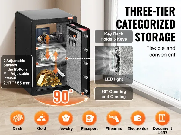 VEVOR Single Door 3.5 cu.ft Safe Box with Key Lock & Password, Safe Lock Box with Fireproof Bag, Key Rack, LED Light, and 2 Shelves for Money, Documents, Jewelry, and Valuables, Black