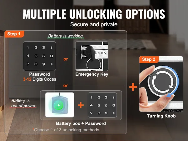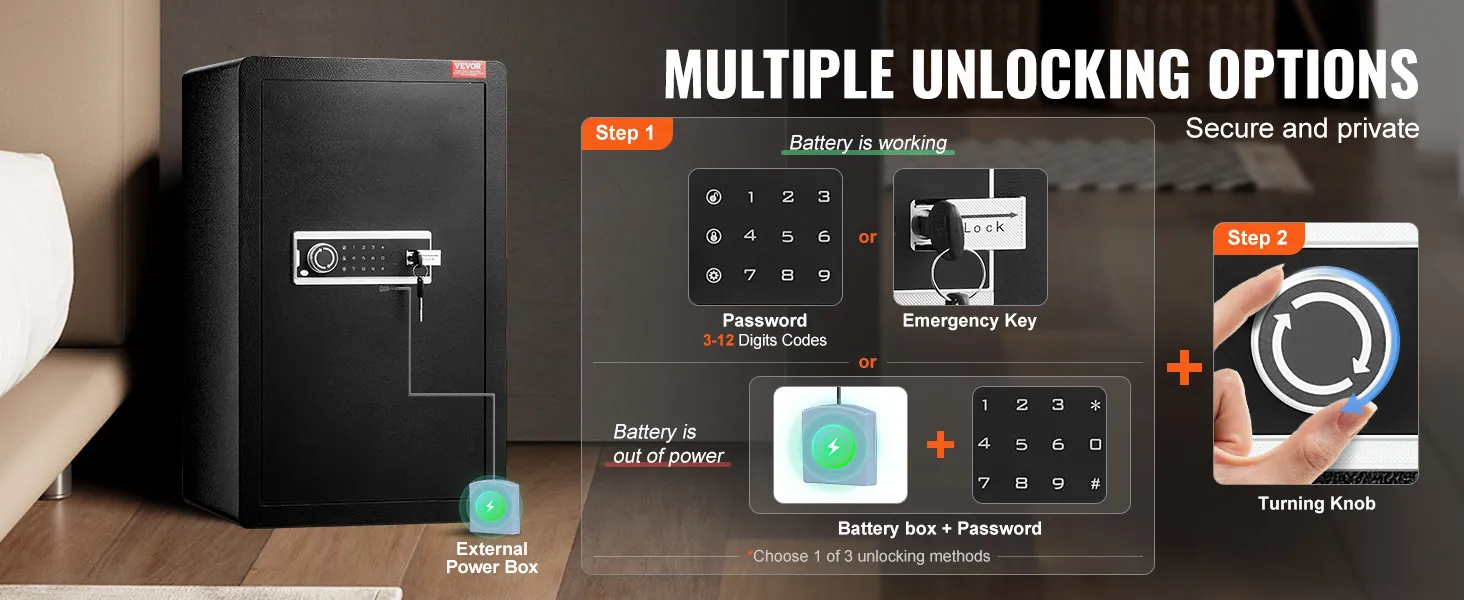 Verhoogde veiligheid: met een sleutel of met een 3-12-cijferige code. Als u de sleutel kwijtraakt en de batterij van het slot leeg is, kunt u nog steeds een extern batterijpakket gebruiken om het slot van stroom te voorzien en met het wachtwoord toegang te krijgen tot de kluis.