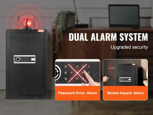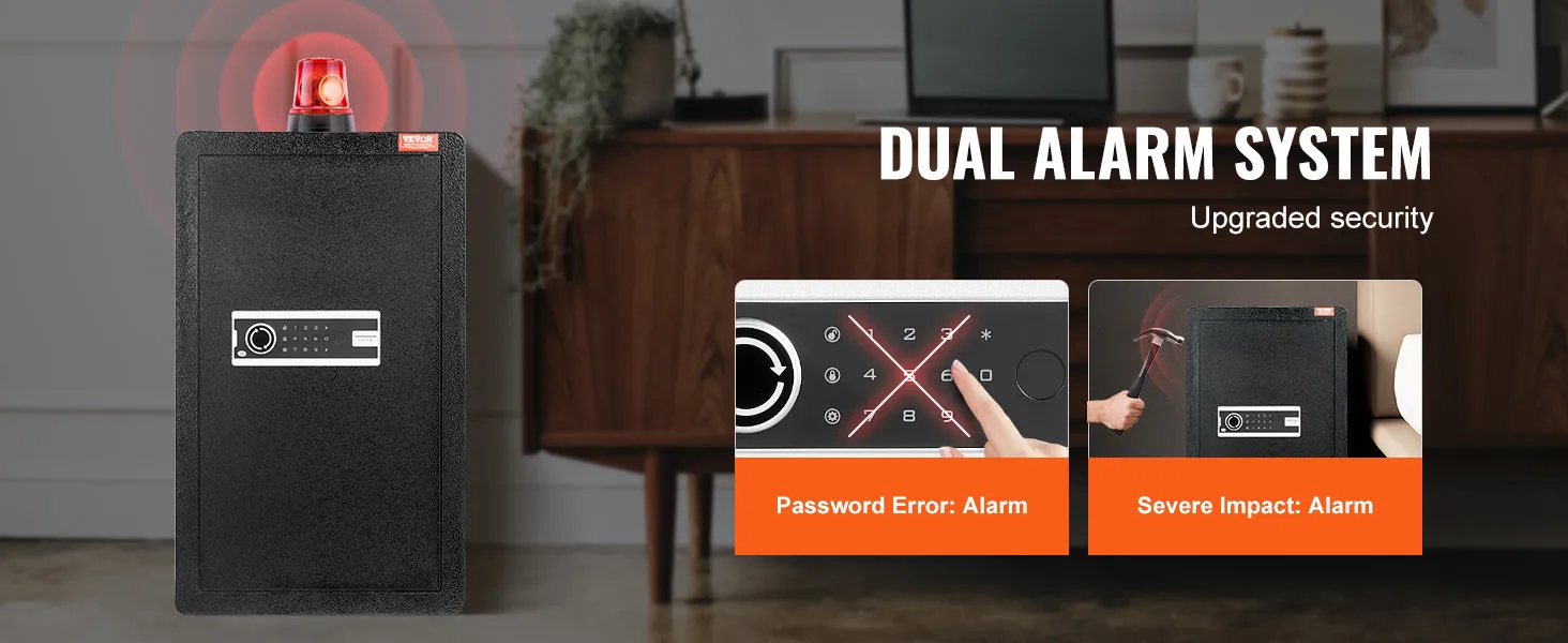 Dubbel alarmsysteem: Het slot is voorzien van een dubbel alarmsysteem. Het activeert een alarm als het wachtwoord drie keer achter elkaar verkeerd wordt ingevoerd of als het wordt blootgesteld aan een sterke impact. Deze extra beveiligingsmaatregel informeert u over elke poging tot diefstal en geeft u gemoedsrust.