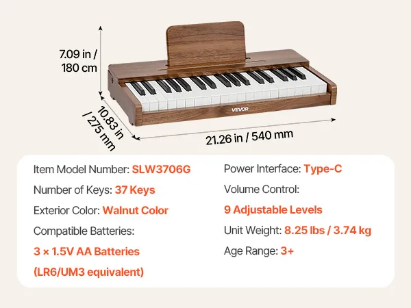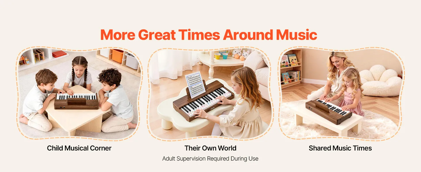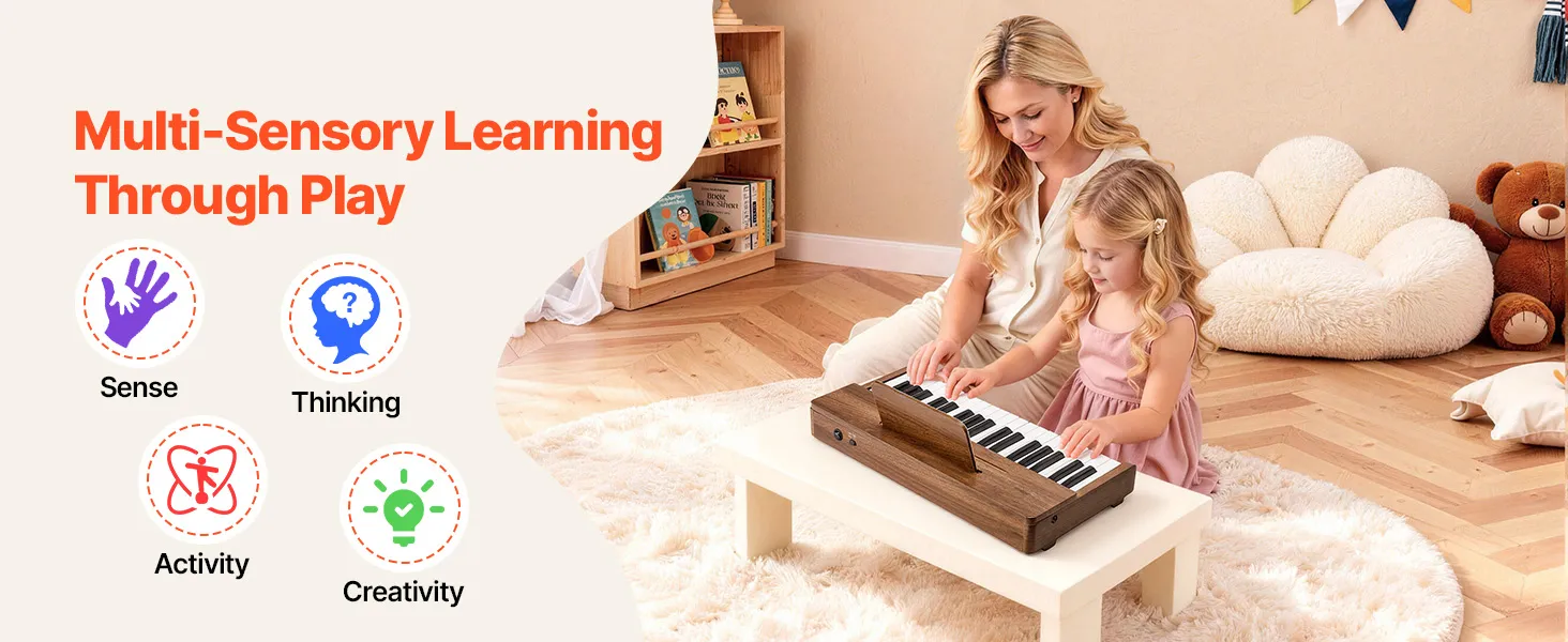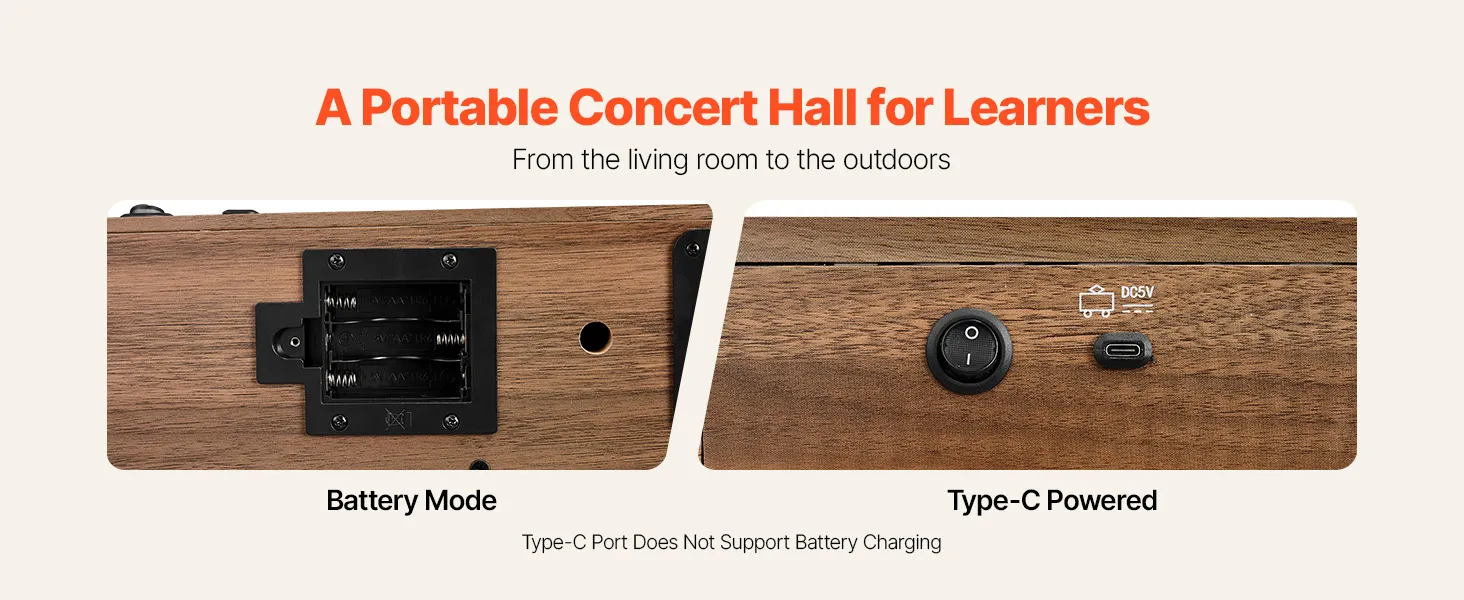 Werkt op netstroom en batterijen: Gebruik batterijen voor onderweg en buitenspelen, of via USB-C voor langer speelplezier thuis. Dankzij de eenvoudige bediening en overzichtelijke lay-out kunnen kinderen muziek ontdekken op hun houten speelgoedpiano in de klas, thuis of tijdens familie-uitjes.