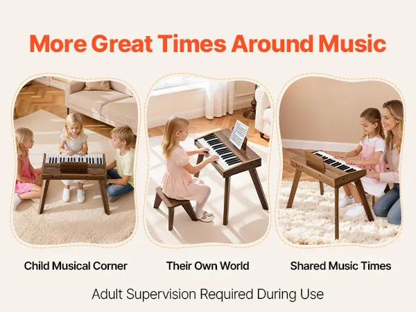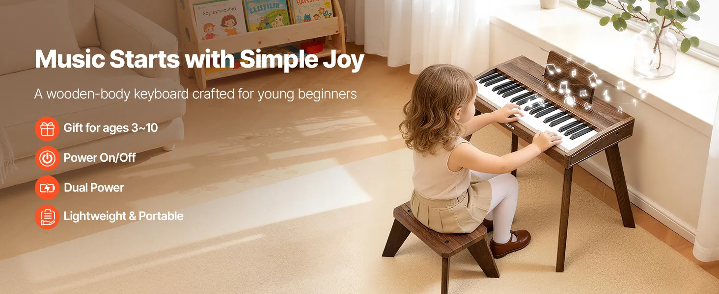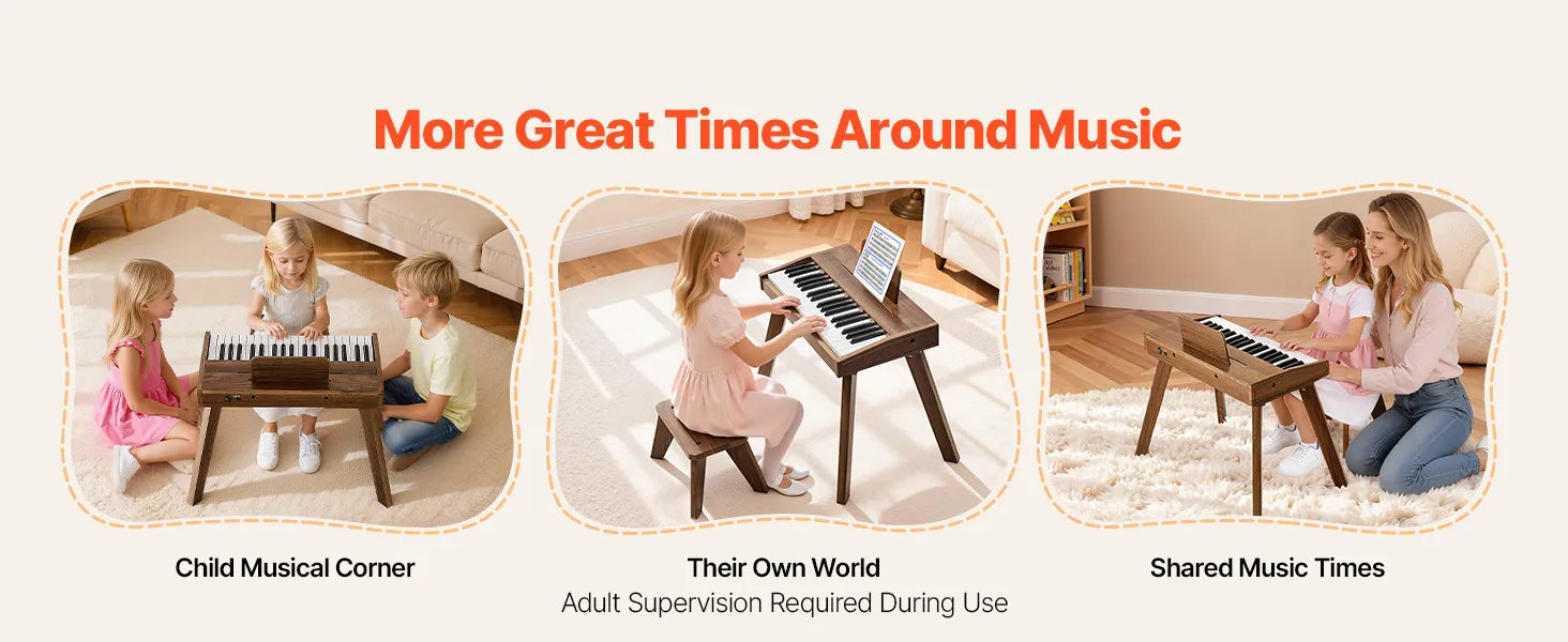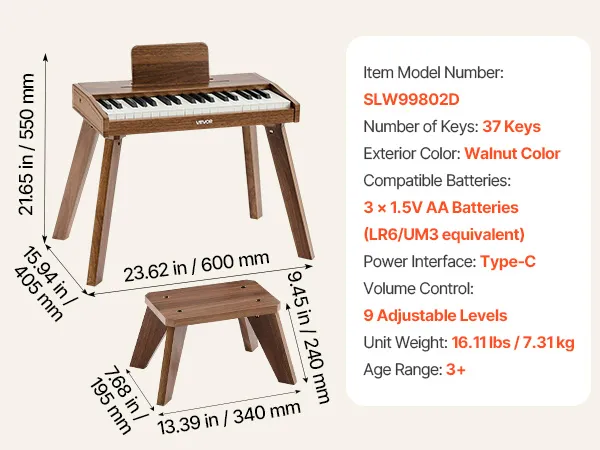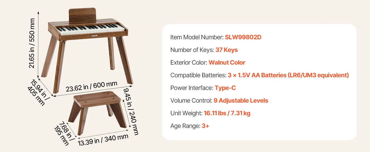 VEVOR Kinderkeyboard, 37 toetsen, houten digitale piano voor kinderen vanaf 3 jaar, mini muziekinstrumentenset met krukje, realistisch geluid, dubbele voeding, regelbaar volume, walnoot