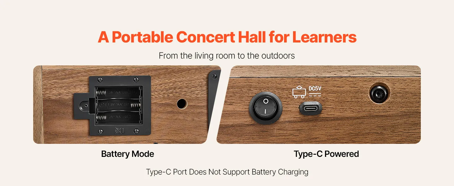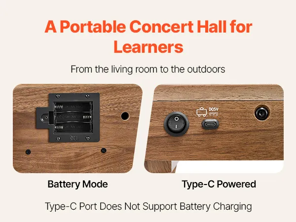 Werkt op netstroom en batterijen: Gebruik batterijen voor onderweg en buitenspelen, of via USB-C voor langer speelplezier thuis. Dankzij de eenvoudige bediening en overzichtelijke lay-out kunnen kinderen muziek ontdekken op hun houten speelgoedpiano in de klas, thuis of tijdens familie-uitjes.
