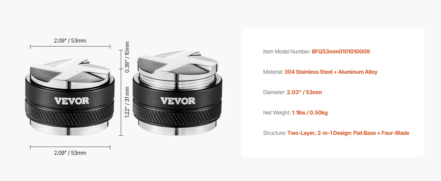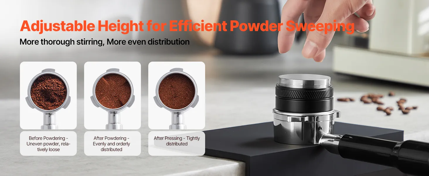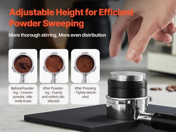 Verstelbare hoogte: De hoogteverstelling van deze koffieverdeler maakt het mogelijk om deze aan te passen aan verschillende portafilterdieptes, wat zorgt voor een gelijkmatige aanstamping en een espresso van hogere kwaliteit, ongeacht of u standaard of aangepaste portafilters gebruikt