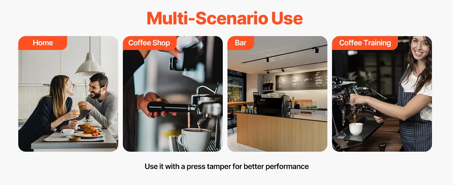 53mm 2-in-1 zwaartekrachtkoffieverdeler: Deze koffieverdeler heeft een dubbelzijdig ontwerp voor distributie en aanstampen. Hij kan eenvoudig tussen de twee schakelen om de efficiëntie van de koffiebereiding te verbeteren