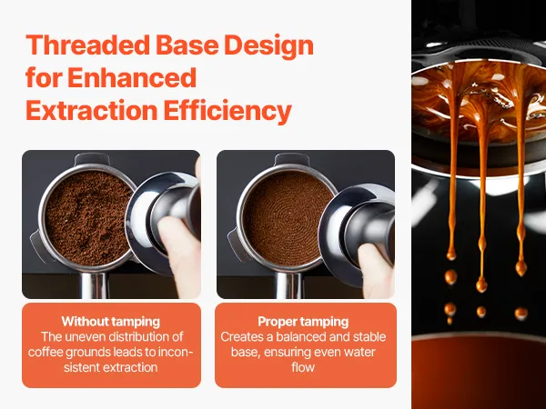 Made of food-grade stainless steel, the tamper is corrosion-resistant and easy to clean. Its threaded base ensures tight tamping, leading to better extraction. The rust-resistant design features durability and security.