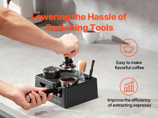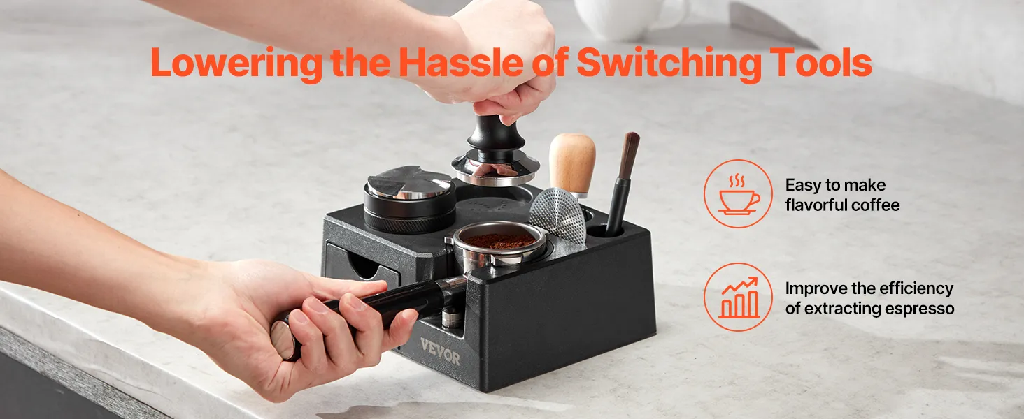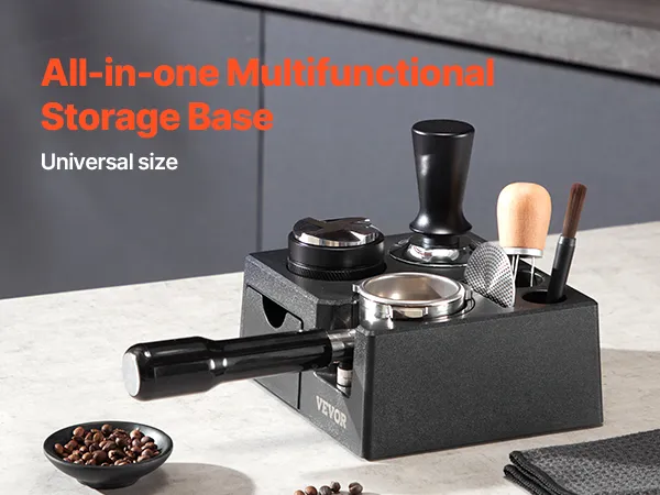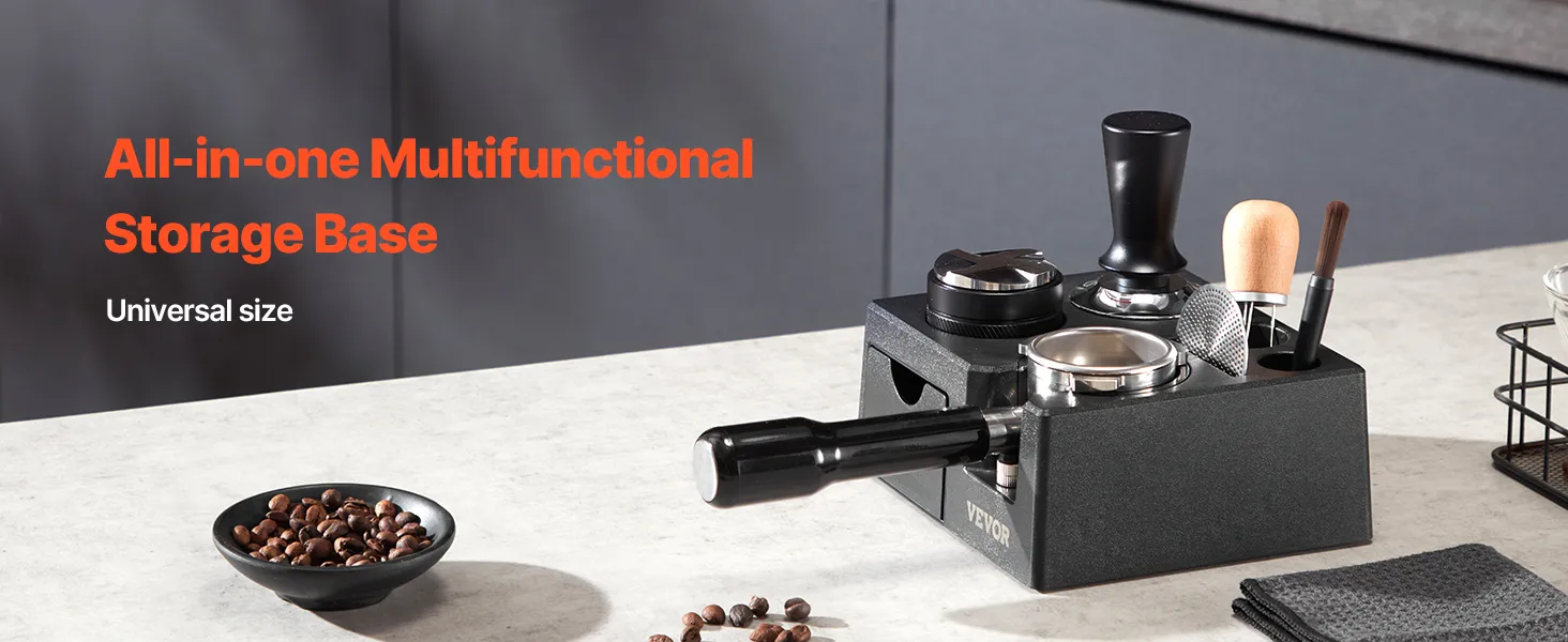 The compact storage base saves space while accommodating various tampers, distributors, and other tools. The adjustable handle height ensures comfort, and the silicone feet on the four corners provide stability and lower noise.