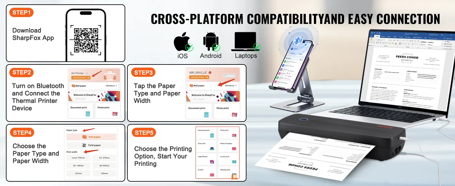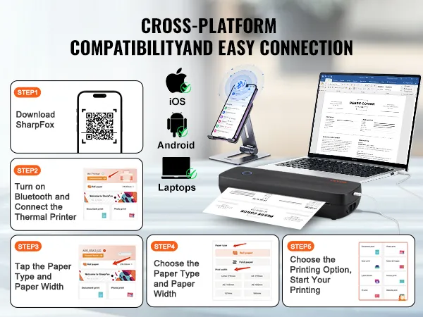 Hoge compatibiliteit: of u nu een Android-telefoon, iOS-tablet-pc of laptop gebruikt, onze draadloze mobiele printer kan eenvoudig worden aangesloten via Bluetooth of USB. Geniet van naadloos printen op verschillende apparaten, zonder beperkingen.