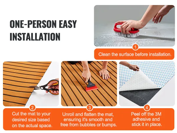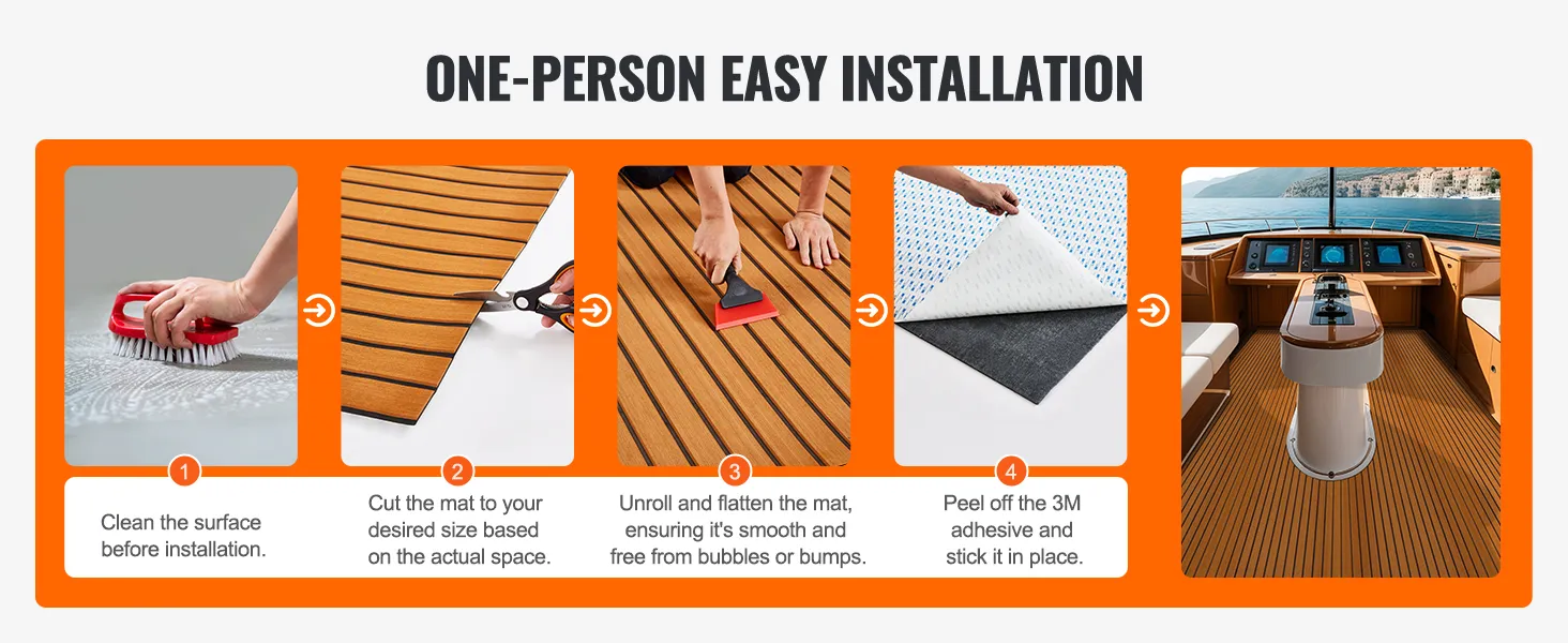 Het installatieproces is heel eenvoudig. U kunt het materiaal knippen met een scherp stanleymes of een schaar. De lijm hecht goed op schone, gladde oppervlakken. Dit zorgt ervoor dat de vloer op zijn plaats blijft. Er zijn geen extra lijmen of kleefmiddelen nodig. Het bespaart u tijd en moeite. De vloer kan binnen 3-5 uur worden geïnstalleerd. Het is dus ongelooflijk handig voor elke booteigenaar.