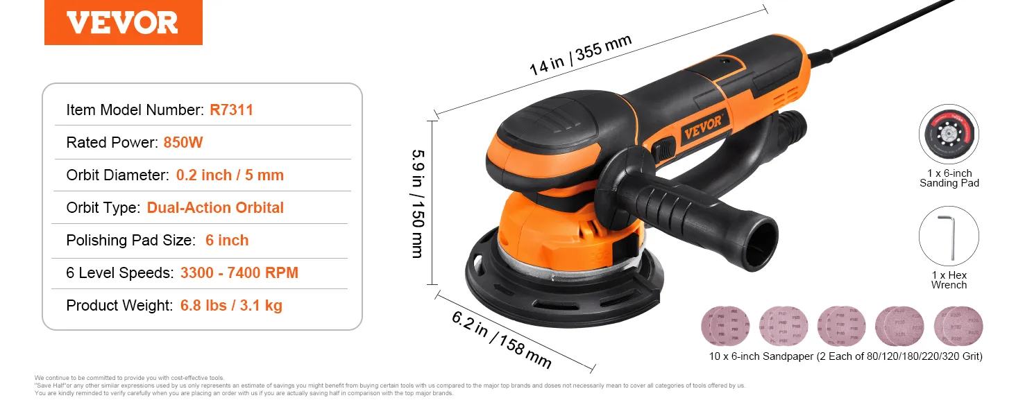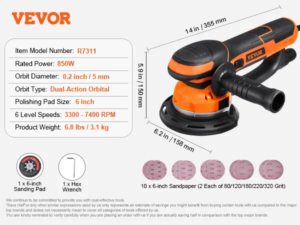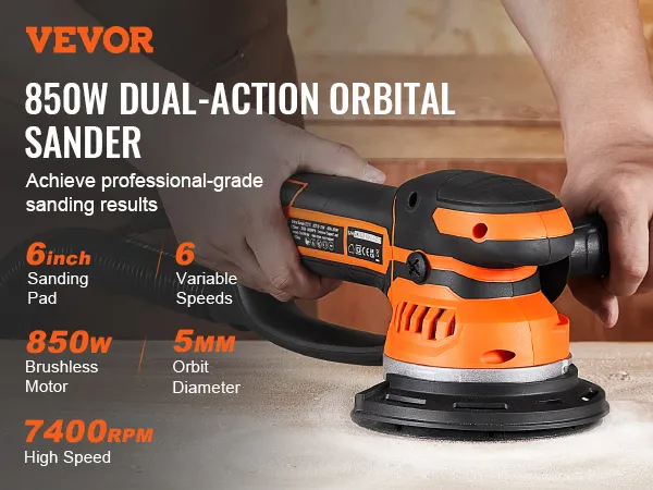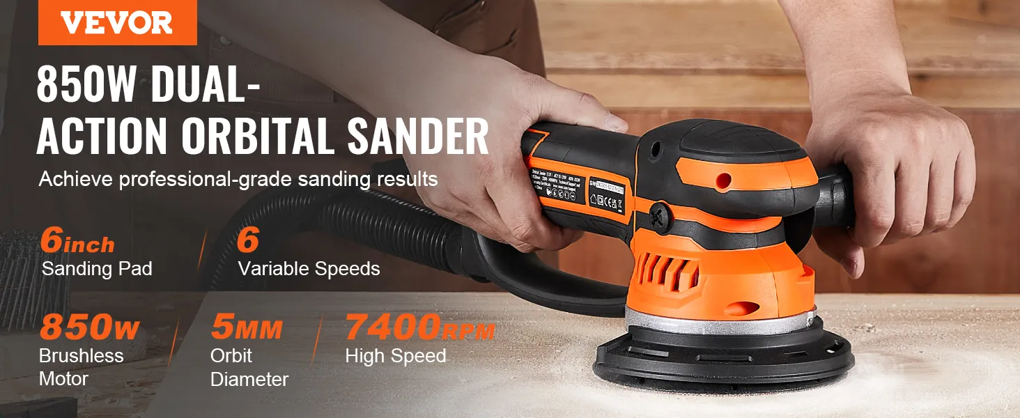 VEVOR excentrische schuurmachine, 15,24 cm DA & GA Dual-Action schuurmachine, 850 W, 7400 RPM, 6 snelheden, excentrische schuurmachine met 10 schuurpapieren, stofaansluiting voor detailschuren in houtbewerking