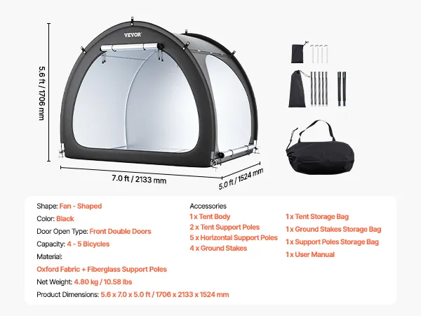 Onze fietsenstalling is voorzien van een waterdichte dubbellaagse coating en zilvergecoat 210D Oxford-materiaal voor duurzaamheid. Het robuuste glasvezelframe zorgt voor stabiliteit, terwijl het lichte ontwerp zorgt voor een snelle montage. Ventilatieramen houden het interieur droog en fris.