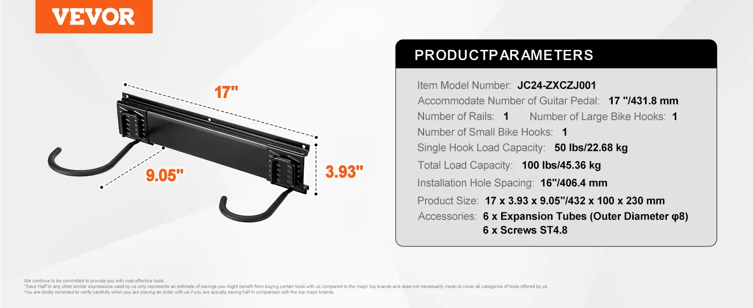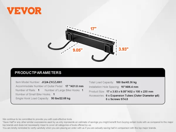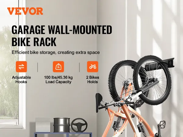 100 lbs/45.36 kg Strong Support: Engineered for durability, our steel garage bike rack's hooks each hold up to 50 lbs/22.68 kg, with a total capacity of 100 lbs/45.36 kg. Ideal for securely storing your bikes.