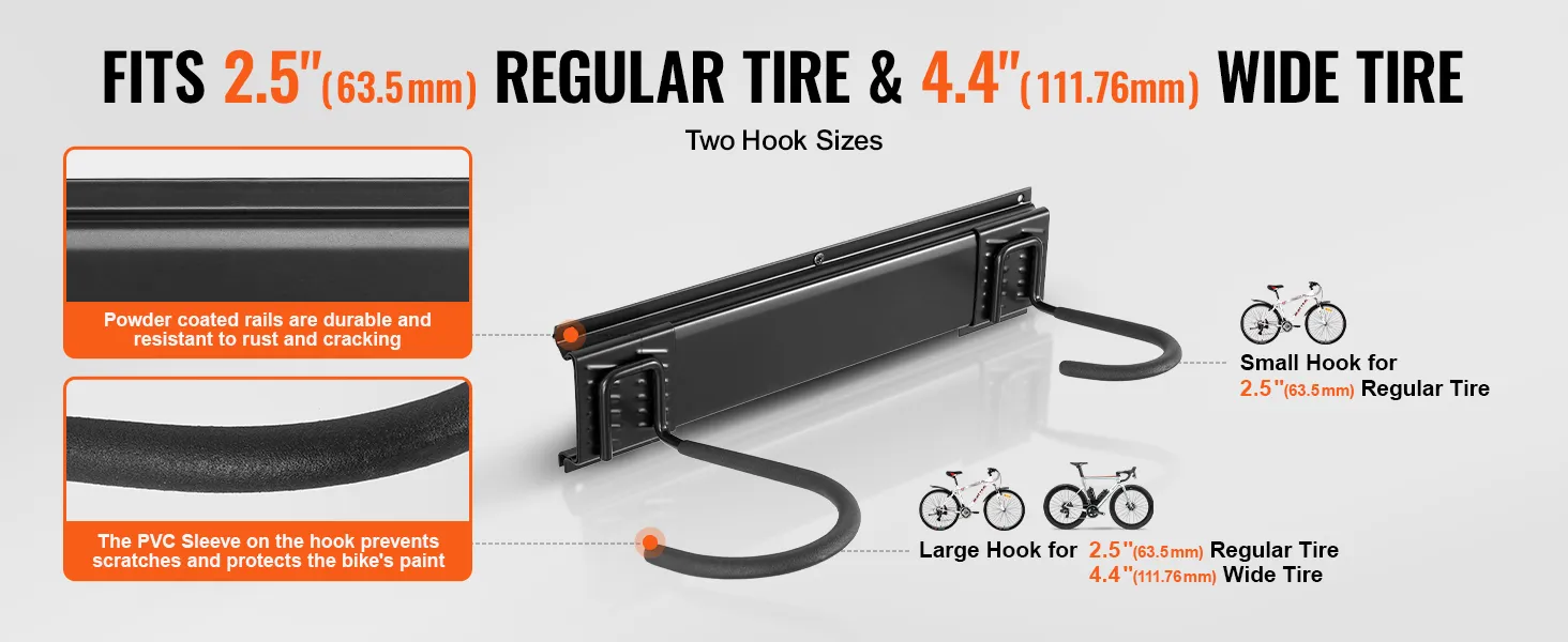 Versatile Hooks: To accommodate a variety of bike types, this bike rack comes with two hook sizes, capable of hanging standard 2.5 in/63.5 mm tires and wider 4.4 in/111.76 mm fat tires. Suitable for mountain bikes, road bikes, folding bikes, adult bikes, and children's bikes.