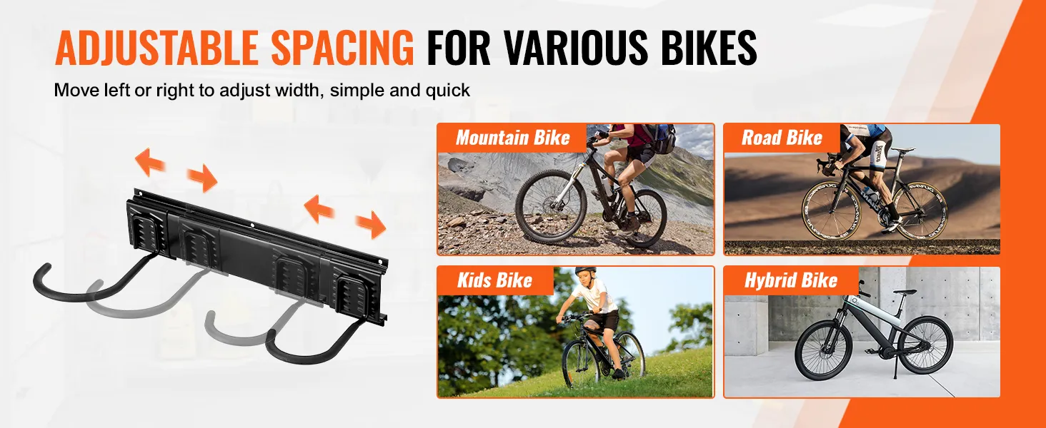 Adjustable Spacing: The bike wall rack's hooks are attached to the rail with a slot-and-slide mechanism, allowing the hooks to move laterally. This design lets you adjust the spacing between hooks to fit different bicycle types. Tailor the setup to your specific storage needs.