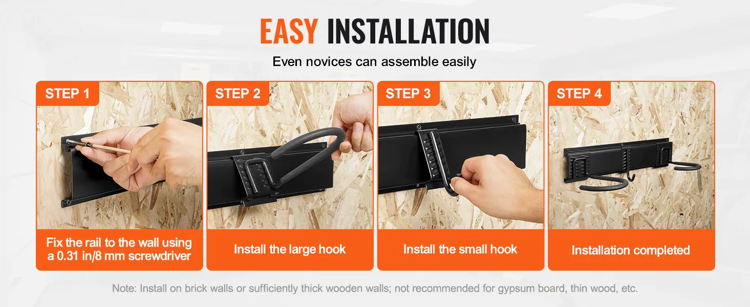 Install with Ease: Setting up this hanging bike rack is a breeze—just grab a 0.31 in/8 mm screwdriver and you're set. We recommend mounting it on solid walls like brick or sturdy wood with sufficient thickness to ensure stability and security.