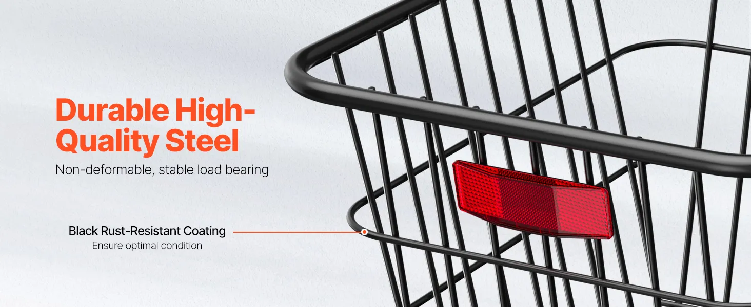 Made from sturdy heavy-duty metal, the bike basket ensures durability and resistance to deformation. The smooth, rust-resistant coating makes cycling in humid, rainy weather more comfortable.