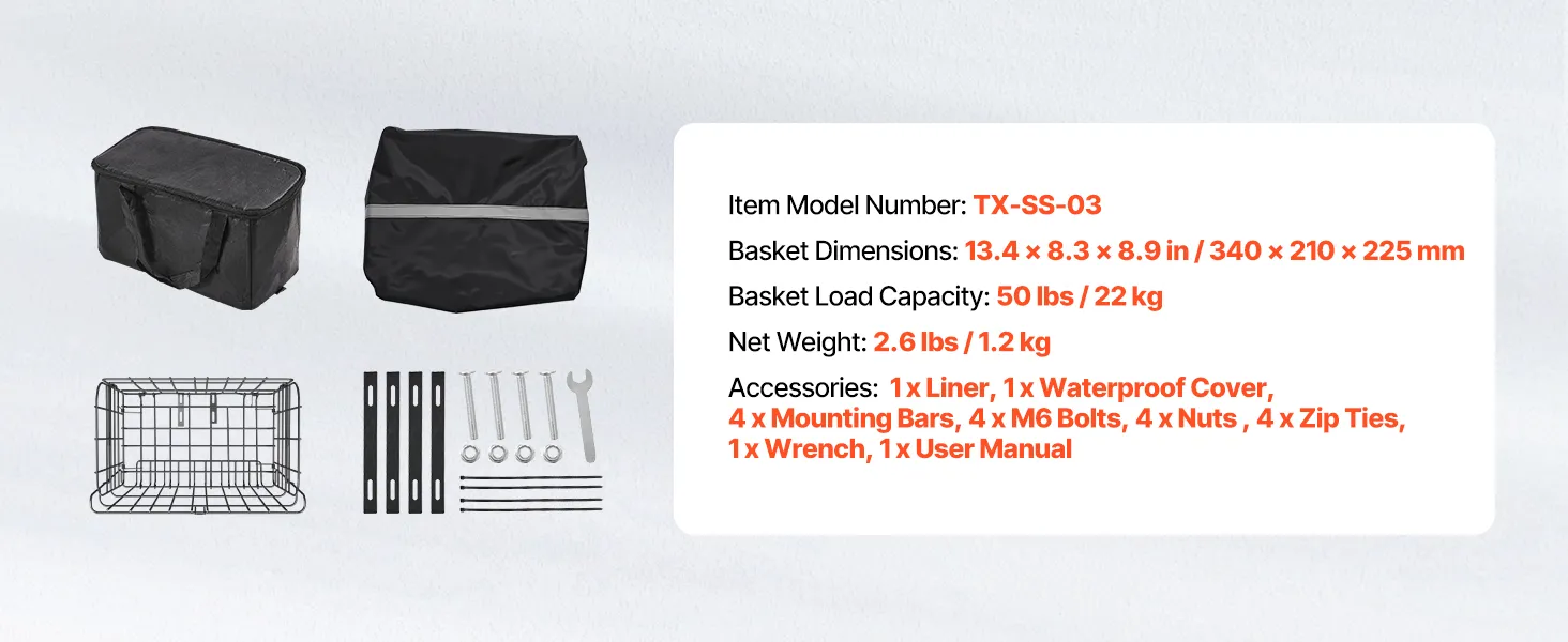 Opvouwbaar ontwerp: Deze fietsmand kan binnen enkele minuten op uw fiets worden gemonteerd met behulp van de meegeleverde schroeven. Dankzij het opvouwmechanisme is het apparaat eenvoudig en ruimtebesparend op te bergen. Zorg ervoor dat u de veervergrendeling voorzichtig bedient om de veiligheid te garanderen en verwondingen aan uw handen te voorkomen.