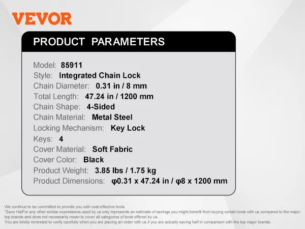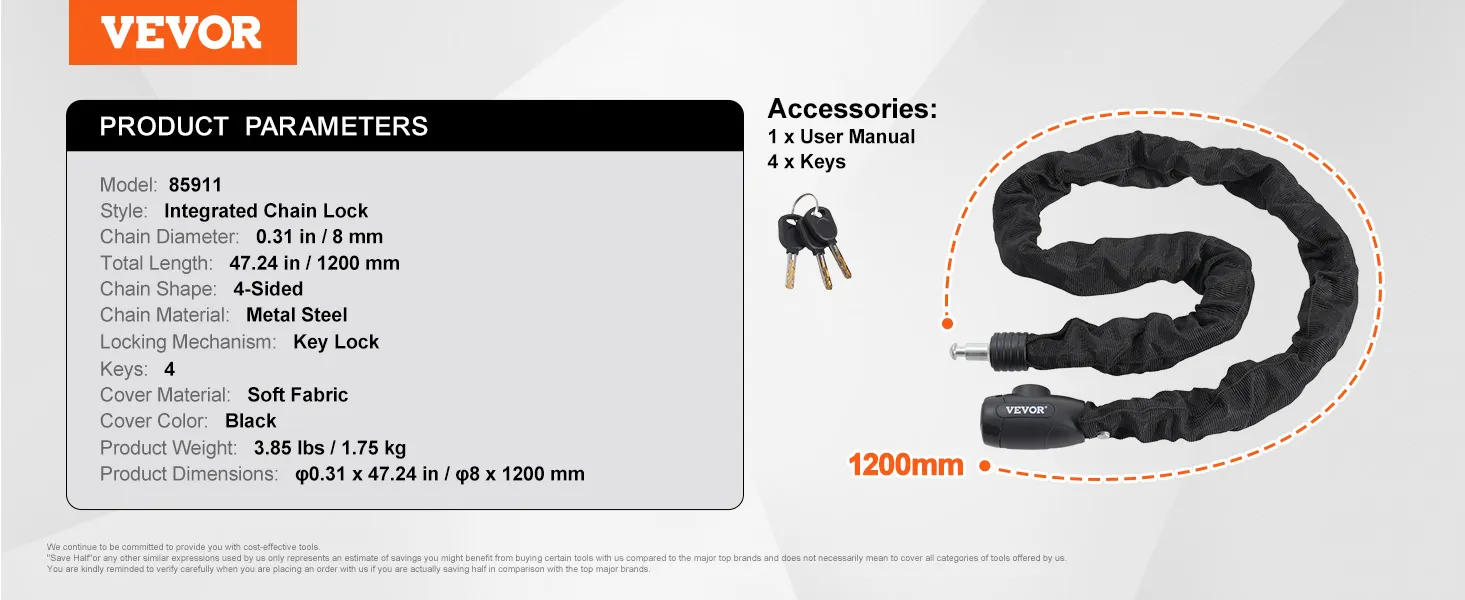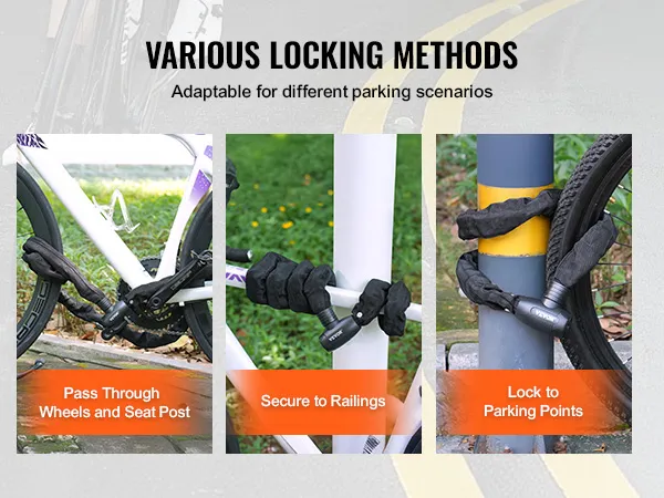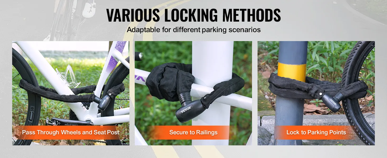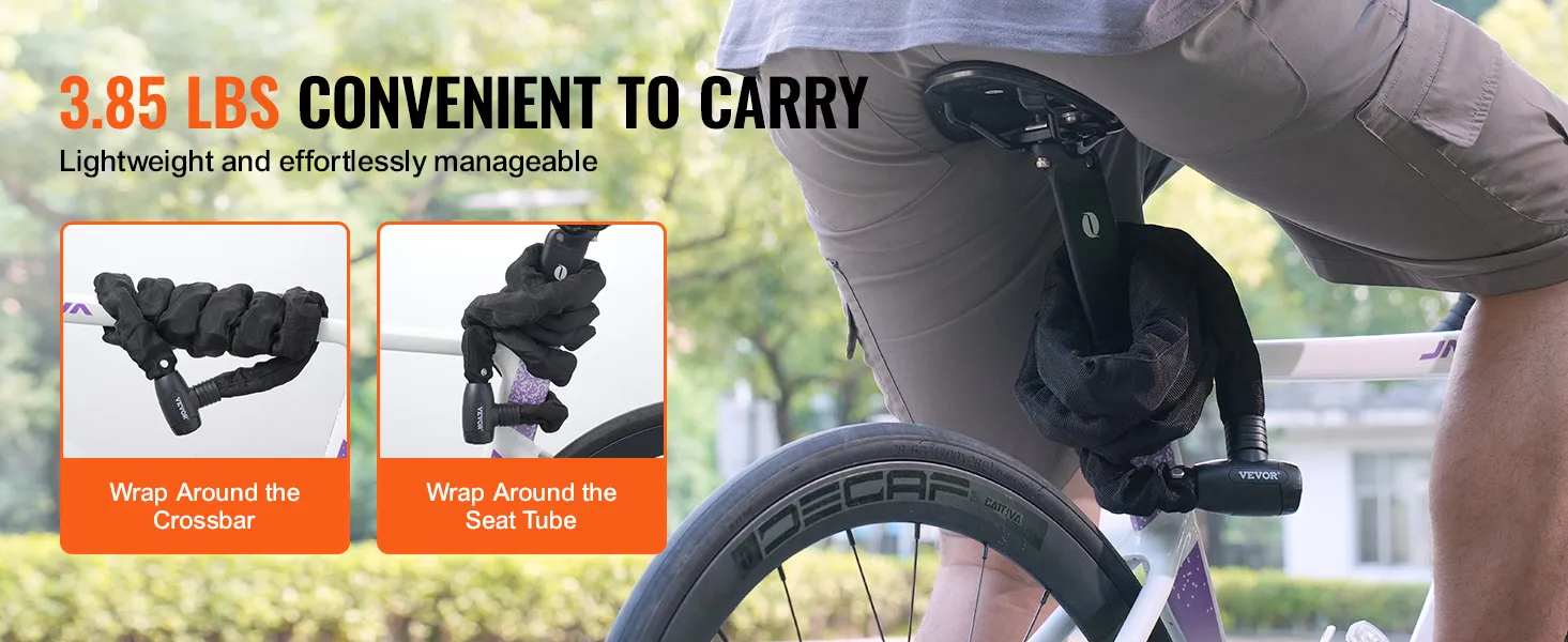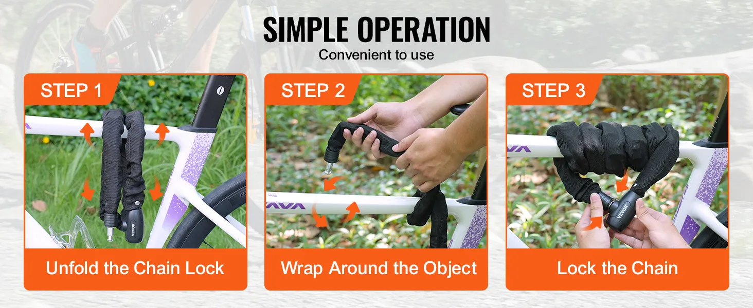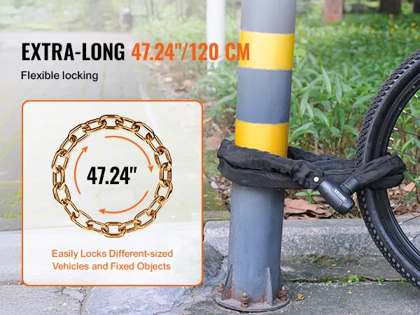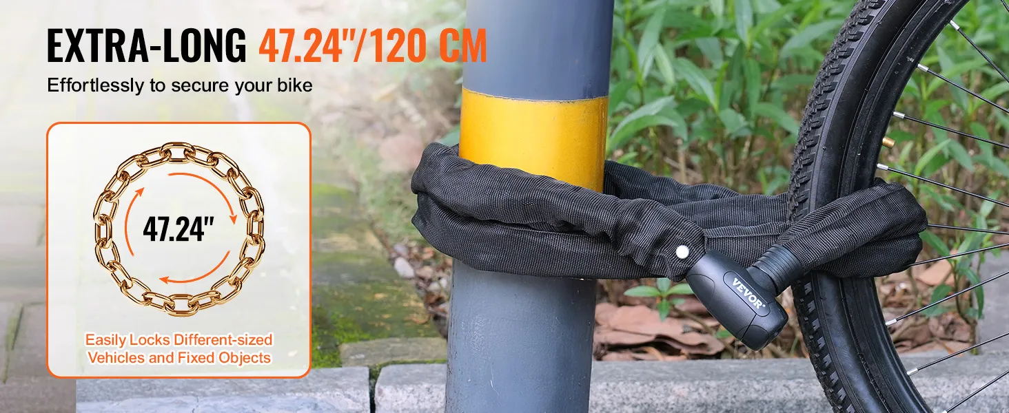 Met het 120 cm lange kettingontwerp kunt u eenvoudig voertuigen en vaste voorwerpen van verschillende afmetingen beveiligen, waar u ook heen gaat.