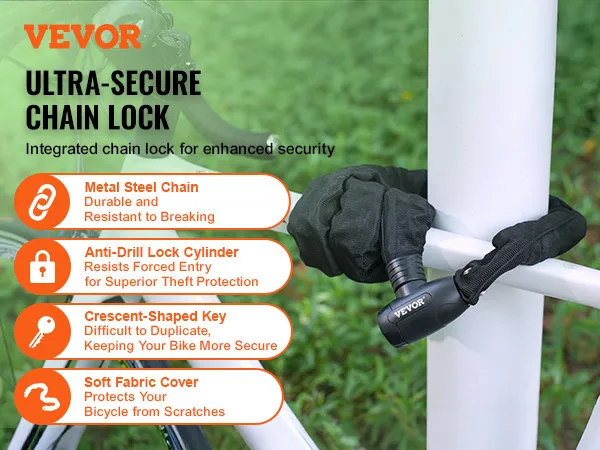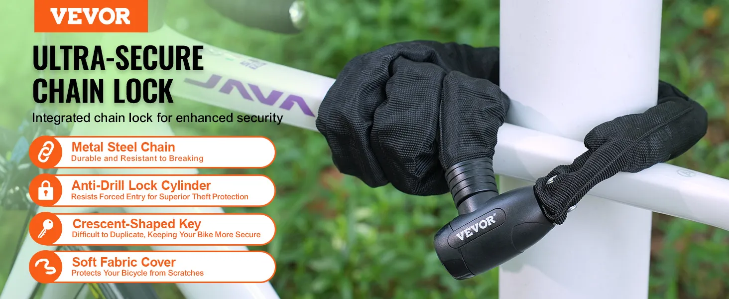 Kettingconstructie: dit fietskettingslot is voorzien van een ketting van hoogwaardig metaalstaal met een diameter van 8 mm (0,31 inch). Het is stevig en duurzaam en is effectief bestand tegen gewelddadige aanvallen om uw fiets te beschermen.