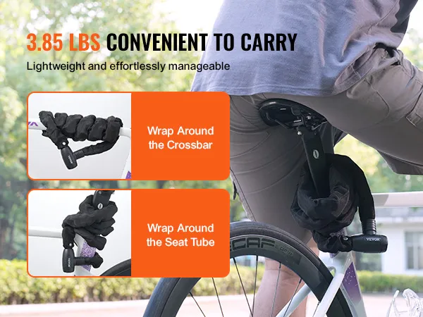 Dit fietsslot weegt slechts 1,75 kg. Tijdens het rijden kan hij om de bagagedrager en de zitbuis van de fiets worden gewikkeld, waardoor hij comfortabel en zonder last kan worden gedragen.