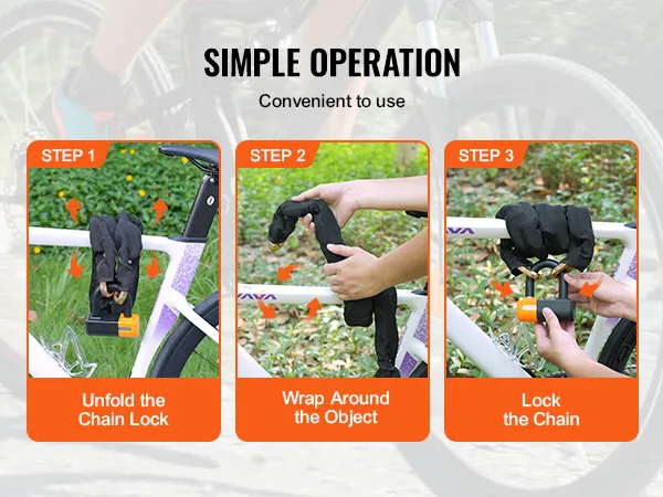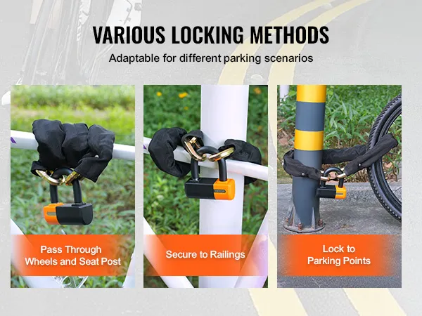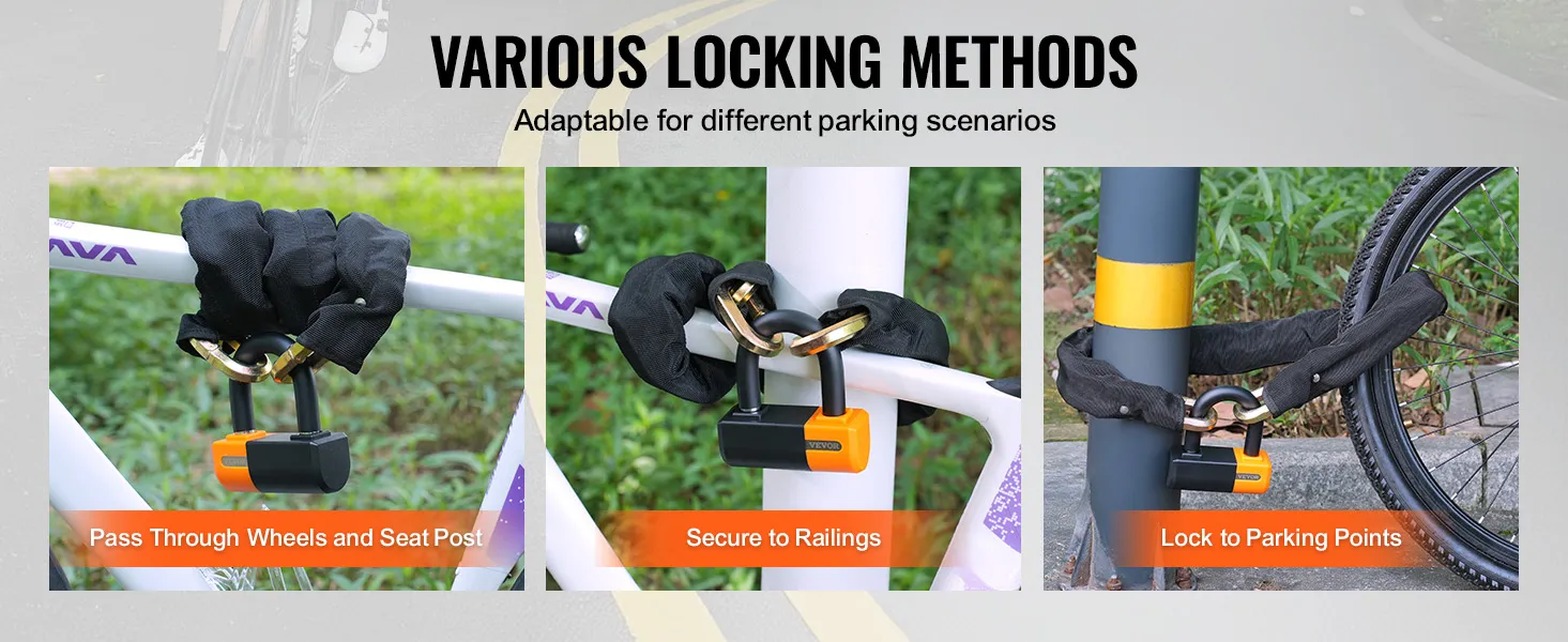 Veelzijdig: het is niet alleen geschikt voor het vergrendelen van fietsen en motorfietsen, maar ook voor het beveiligen van grasmaaiers, sportartikelen, gereedschapskisten, scooters, skateboards, poorten, hekken, roosters, ladders en nog veel meer.
