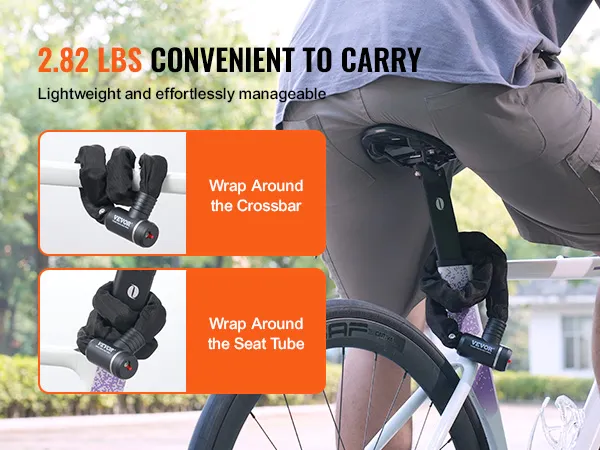 Dit fietskettingslot kan tijdens het rijden om de bagagedrager en de zitbuis van de fiets worden gewikkeld. Het is niet alleen comfortabel om te dragen, maar kan ook de last tijdens het rijden verminderen. Het combineert veiligheid en comfort.