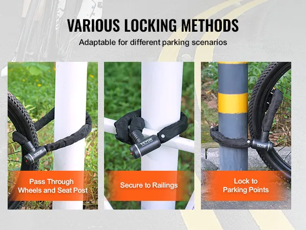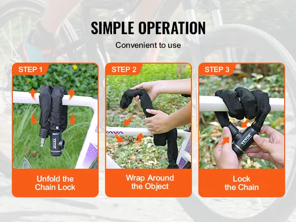 Veelzijdig gebruik: dit fietskettingslot is veelzijdig; Het is niet alleen geschikt voor het vergrendelen van fietsen en motorfietsen, maar ook voor het beveiligen van grasmaaiers, sportartikelen, gereedschapskisten, scooters, skateboards, poorten, hekken, roosters, ladders en meer, waardoor uw waardevolle bezittingen worden beschermd.