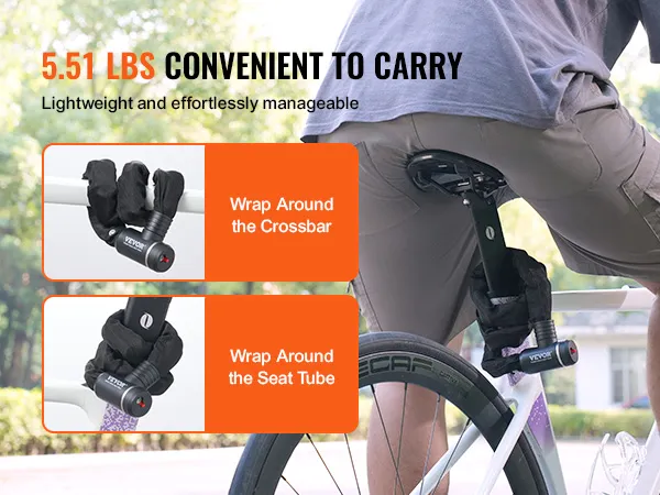 Weighing just 5.51 lbs, this bicycle chain lock can easily wrap around your bike’s top tube and seat post while riding, ensuring portability and reducing weight on your journey without compromising security.