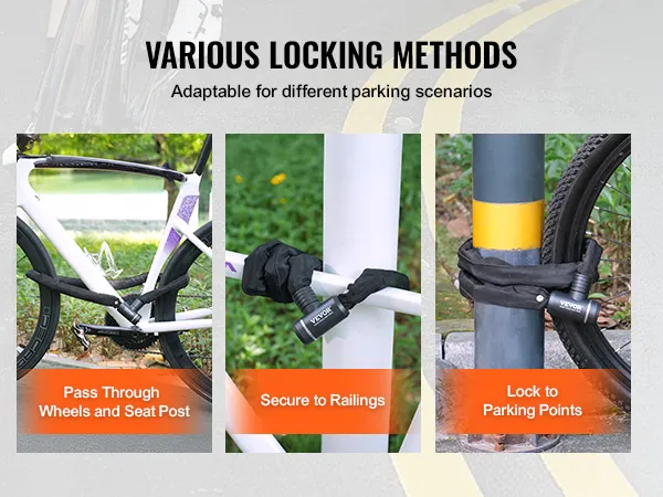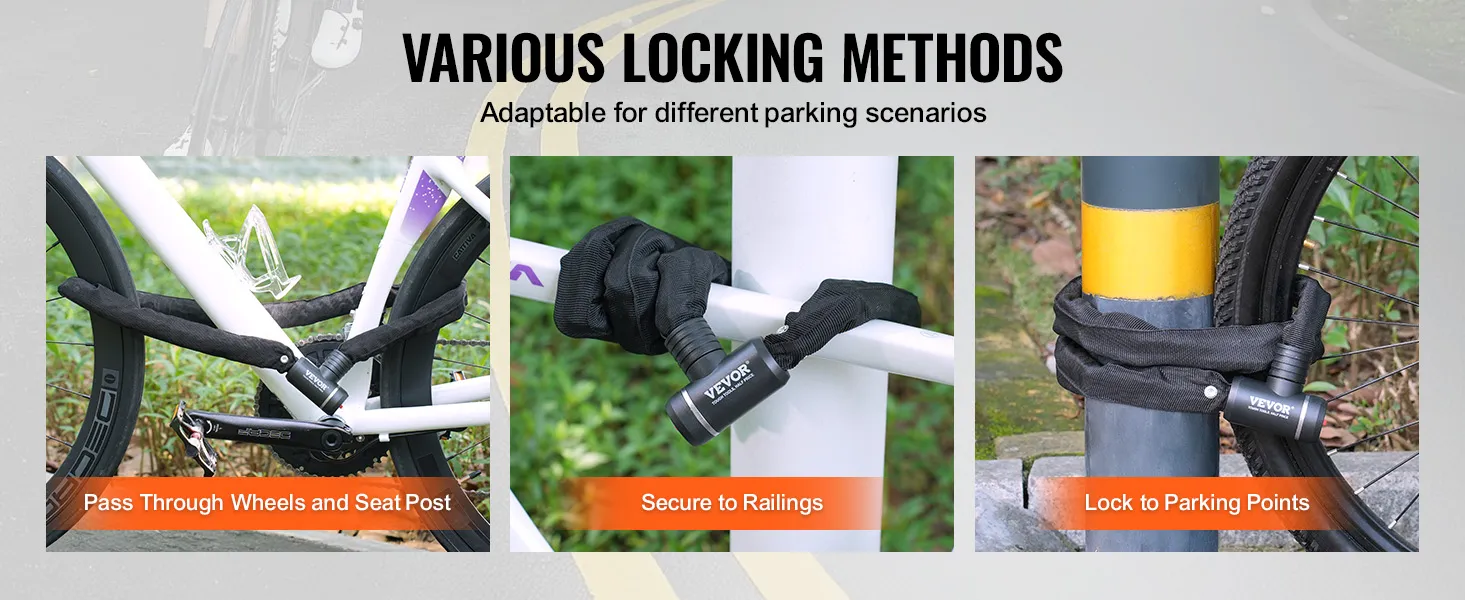 This bike lock chain offers multiple locking methods to adapt to different parking scenarios. Whether locking through the wheel and seat post or securing it to a railing or designated parking spot, it meets all your needs.