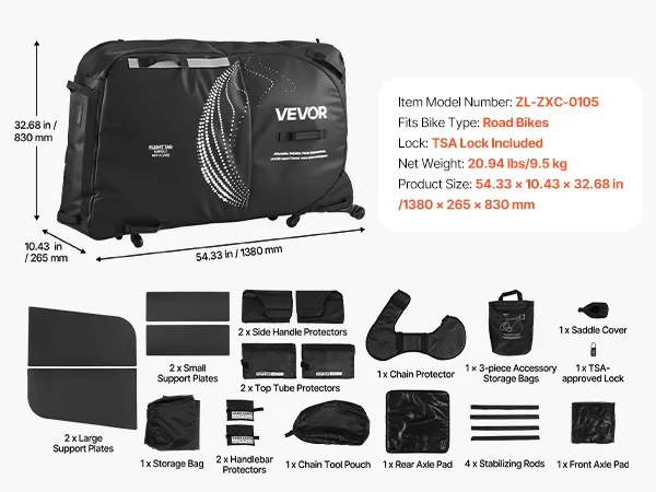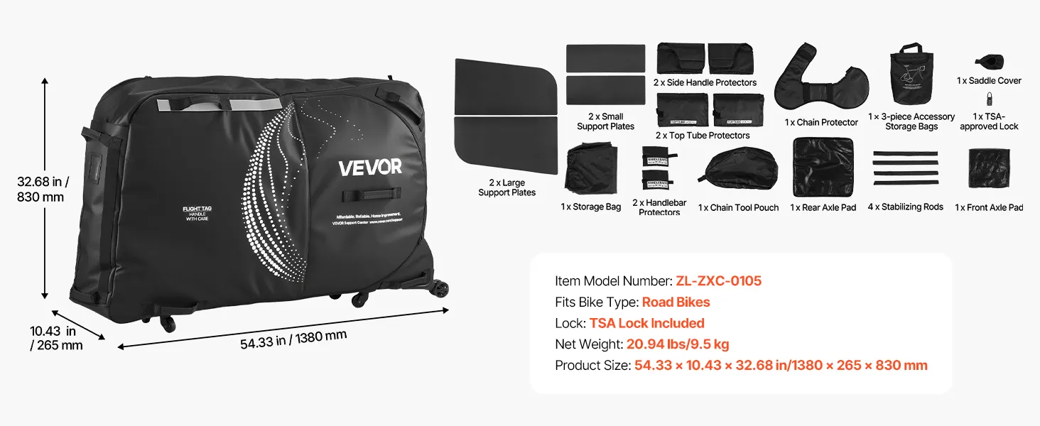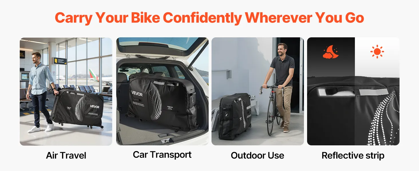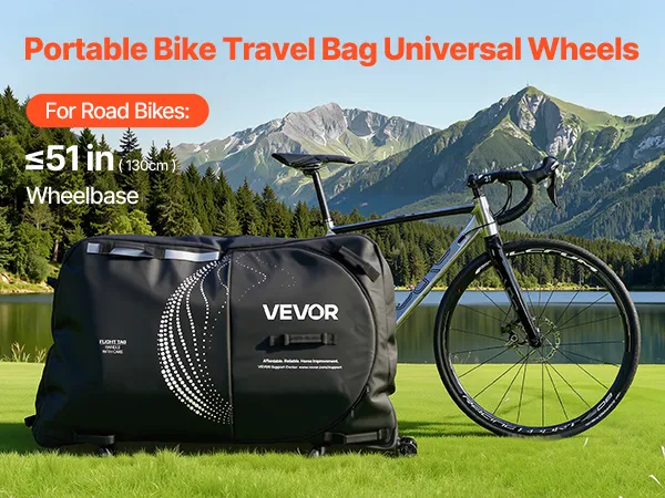 VEVOR fietstransporttas met TSA-slot, steunplaten, beschermingssystemen en vorkstabilisatie, geschikt voor fietsen met een maximale wielbasis van 130 cm voor vliegreizen en buitenactiviteiten.