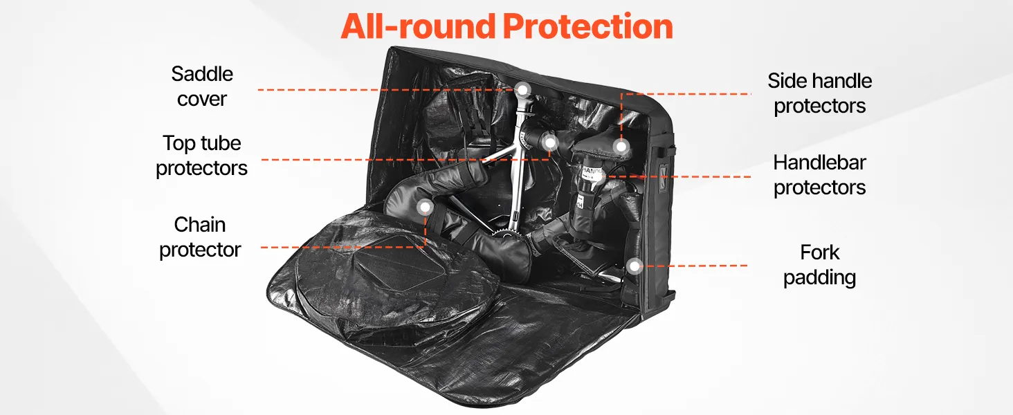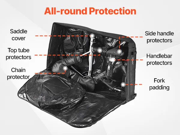 Complete bescherming: Deze voor vliegreizen goedgekeurde fietstas combineert duurzaam materiaal met een complete accessoire-set en een stabiele basis, inclusief bescherming voor de bovenbuis, vorkbeschermers, handvatten, enz. Het ontwerp biedt optimale bescherming voor het frame, de vork en de wielen.