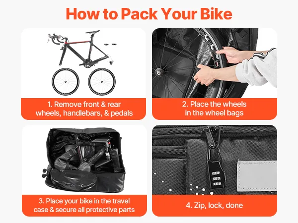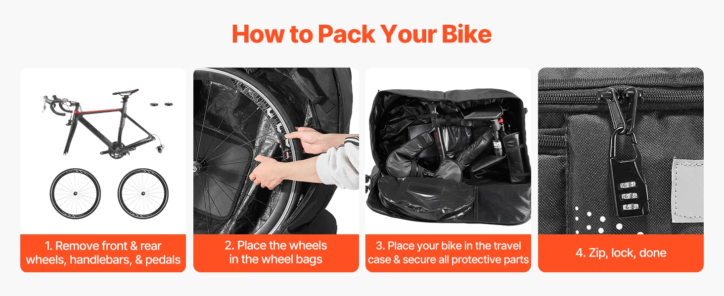 Geschikt voor racefietsen: Deze fietstas is geschikt voor fietsen met een wielbasis tot 130 cm. Je verwijdert de wielen, het stuur en de pedalen en bergt ze apart op in de zadelhoes, stuurbeschermers, kettingkast en andere beschermhoezen voor veilig transport.