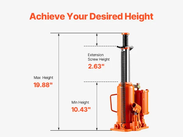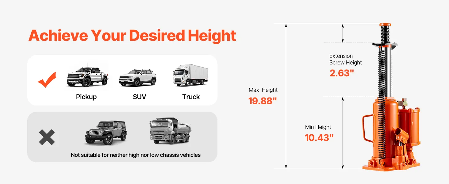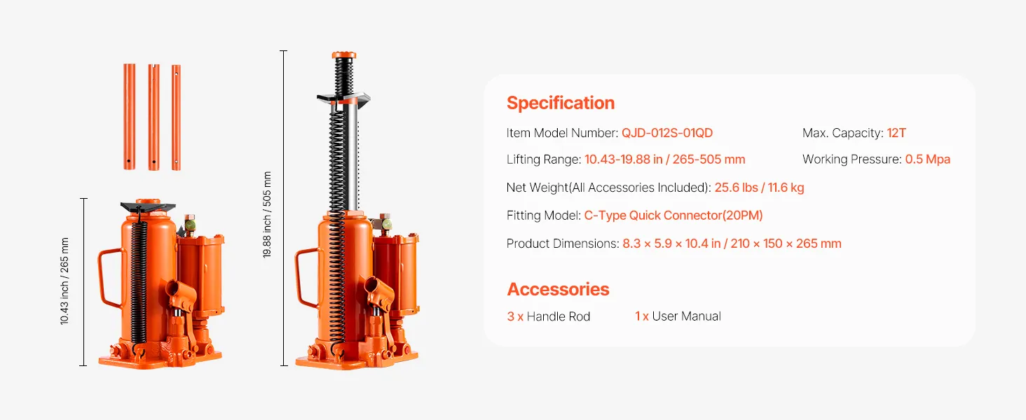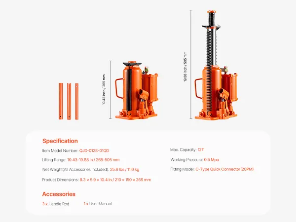 Compatibiliteit met veel voertuigen: deze pneumatische krik heeft een draagvermogen van 12 ton en heeft een hefbereik van 265 tot 505 mm (10,43-19,88 inch) en een verstelbare schroefhoogte tot 60 mm (2,4 inch). Hierdoor is hij geschikt voor diverse voertuigen zoals SUV's, vrachtwagens en pick-ups. Perfect voor bandenwissel en onderhoud.