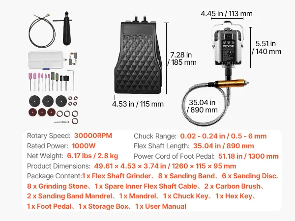 VEVOR Flex Shaft Sander, 1000W 30.000 RPM Roterend Gereedschap, Multifunctionele Hangende Schuurmachine met 31 Accessoires en Voetpedaal voor Houtsnijden, Polijsten, Boren en Polijsten