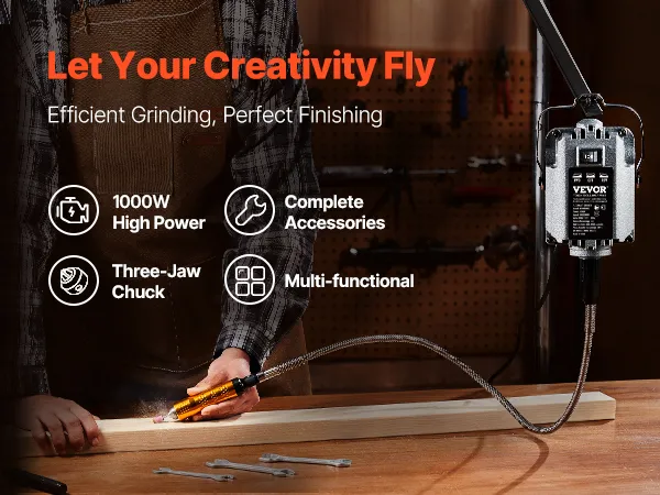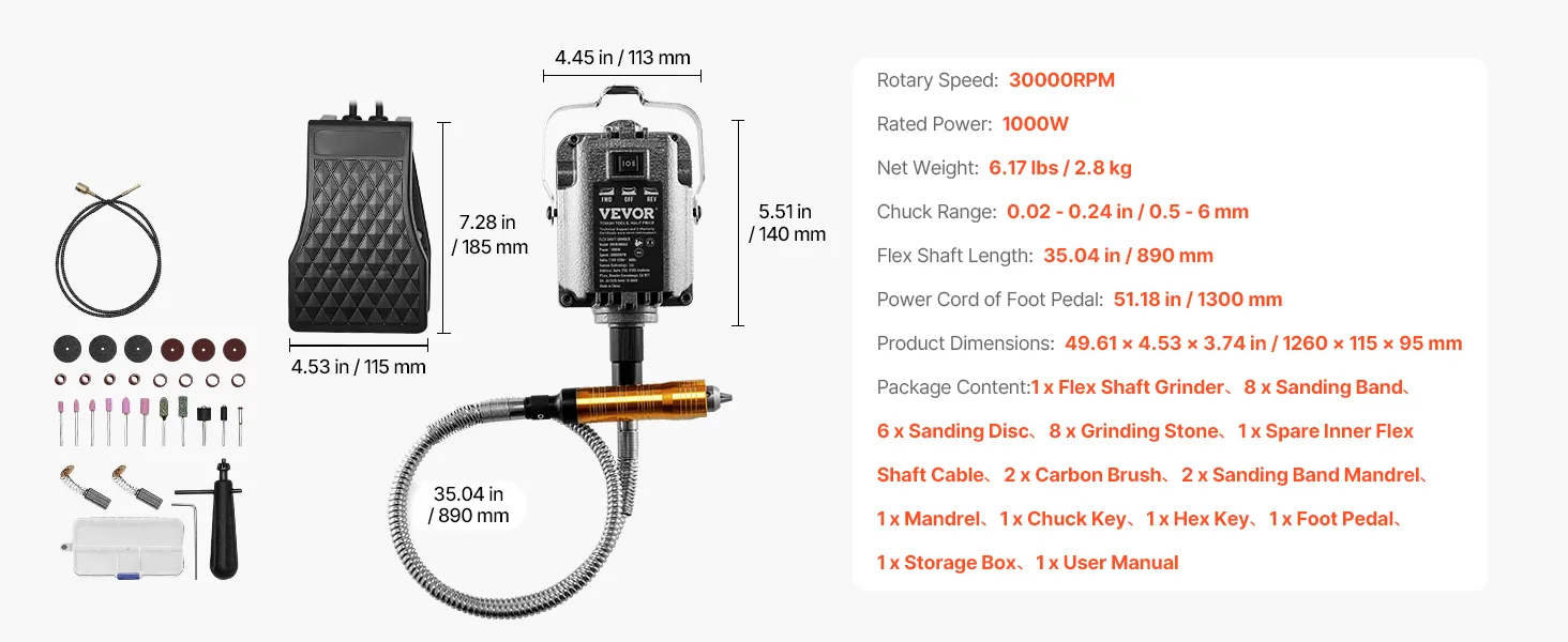 Deze 1000 W flexibele asslijpmachine met hoogwaardige koperen motor en tot 30.000 tpm is ideaal voor snijden, polijsten, boren en meer. De 3-klauwplaat en de flexibele as van 35 inch bieden gemak en flexibiliteit voor elk project.