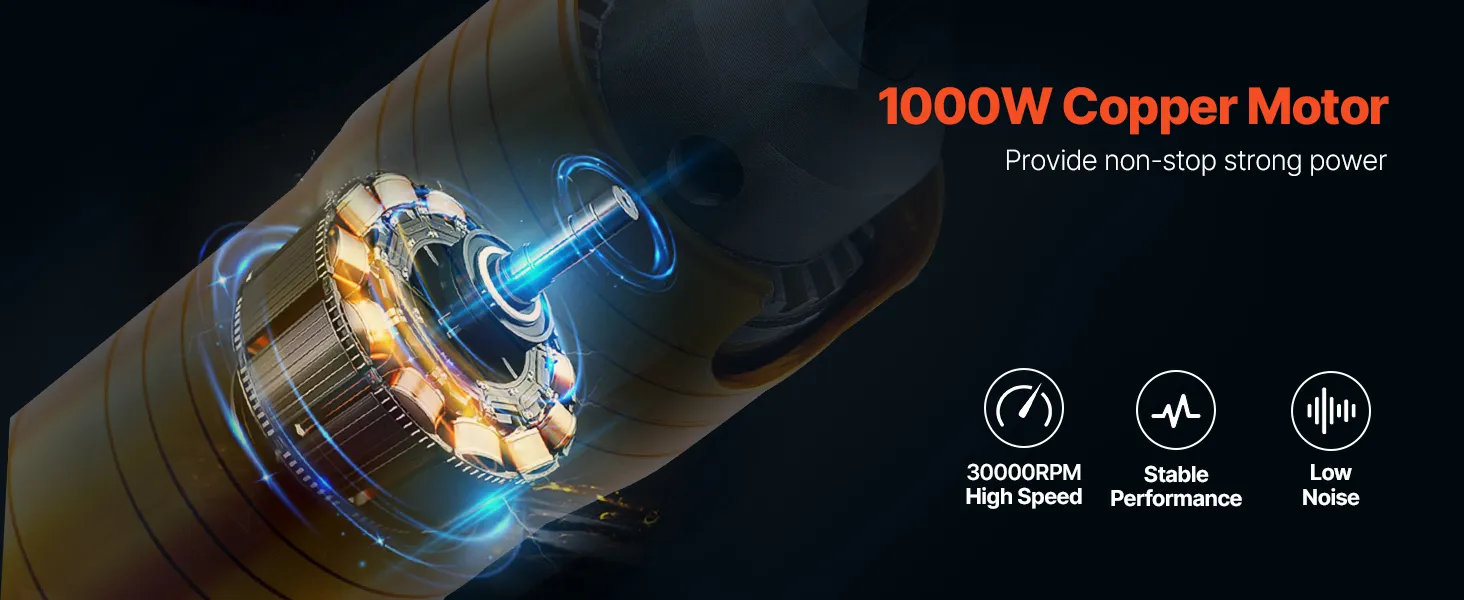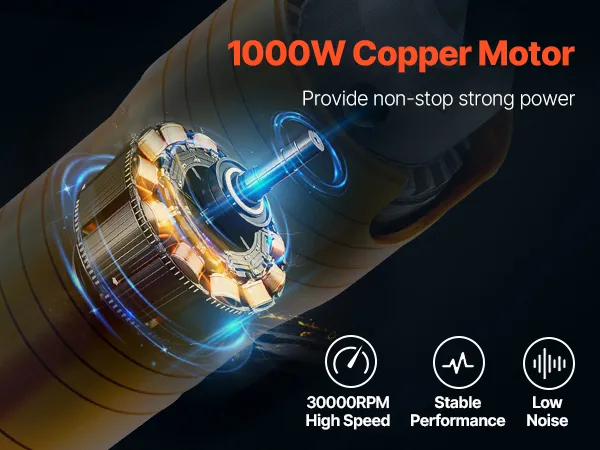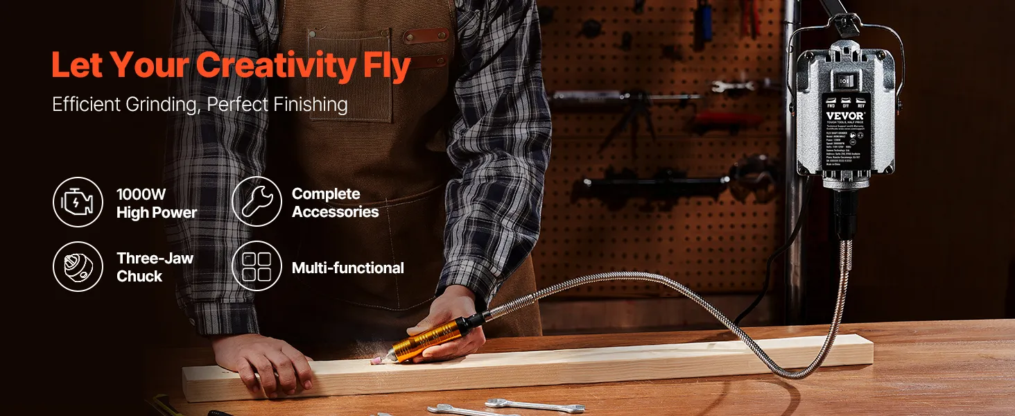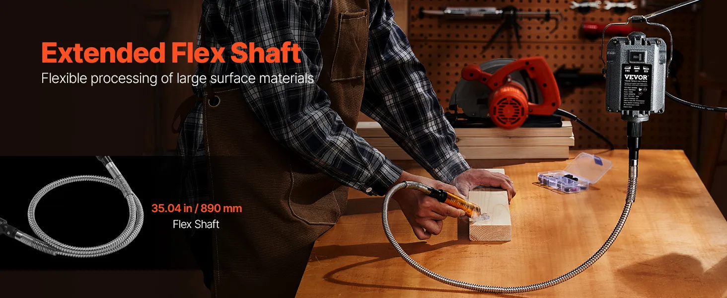 Krachtige motor: Uitgerust met een robuuste koperen motor van 1000 W bereikt deze slijpmachine met flexibele as een indrukwekkend toerental van 30.000 tpm. De stabiele prestaties zorgen ervoor dat u bewerkingstaken gemakkelijk en snel kunt uitvoeren - ideaal voor snijden, polijsten, boren en slijpen.