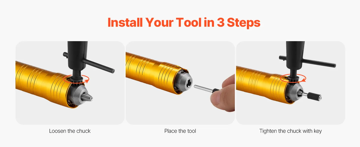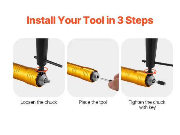 Zeer nauwkeurige drieklauwplaat: dit roterende gereedschap met flexibele as is voorzien van een uiterst nauwkeurige drieklauwplaat met een klembereik van 0,02 tot 0,24 inch / 0,5 tot 6 mm. Het biedt een hoge compatibiliteit en houdt gereedschap veilig onder hoge druk zonder te glijden, waardoor het ideaal is voor nauwkeurig handwerk.