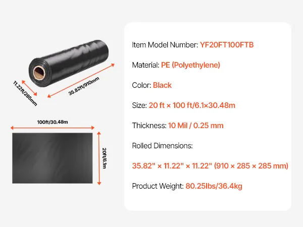 With 10mil thickness, this plastic sheeting resists tearing under tension. Its large sizes, 20x100ft, ensure broad coverage for any project. The black film effectively blocks sunlight to avoid weed growth while resistant to weather conditions. Ideal for weed control, fence protection, insulation.