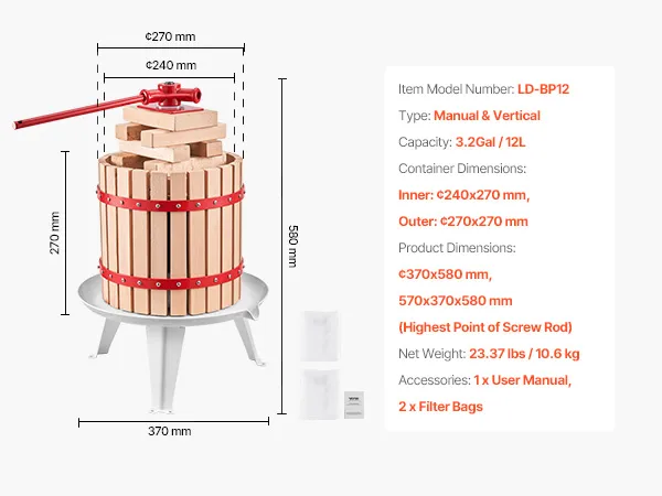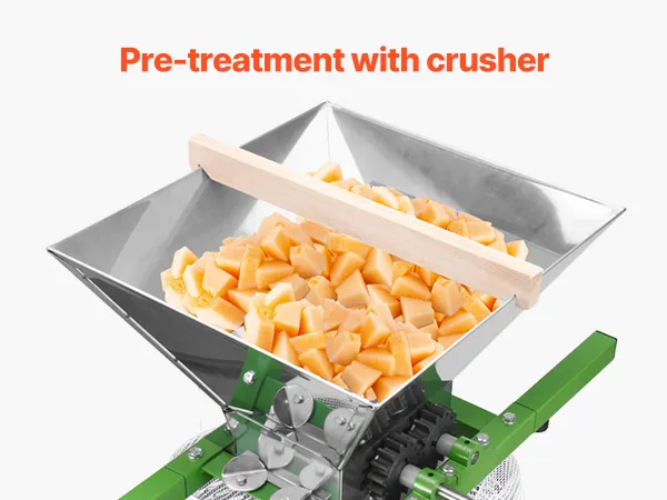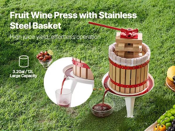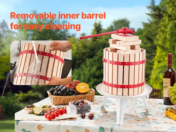 Grote capaciteit: Het ontwerp van 12 liter is ideaal voor familiebijeenkomsten, feesten, wijnmakerijen en boerderijen om gemakkelijk voldoende sap te produceren. Harde vruchten moeten vóór het persen worden geplet en kunnen met de hakmolen worden gebruikt.