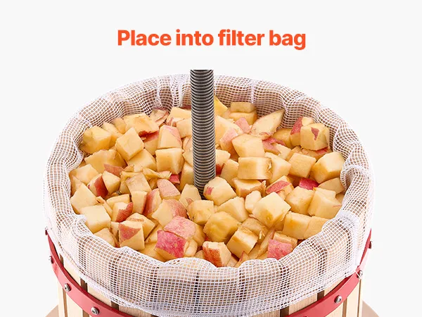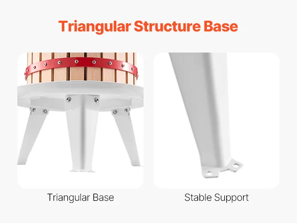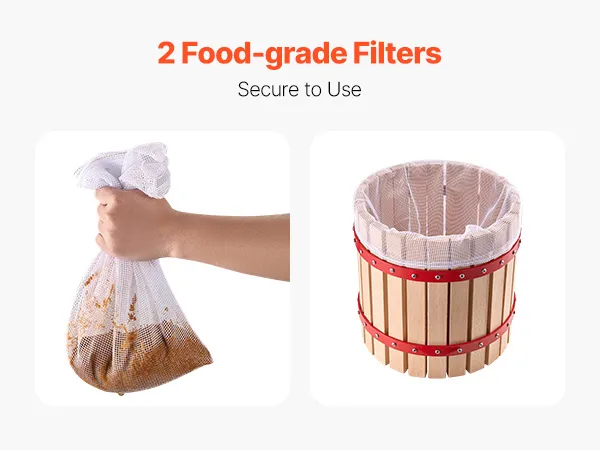 Natuurlijk beukenhout: De massief houten mand is gemaakt van natuurlijk beukenhout met een glad, braamvrij oppervlak. De driehoekige basisstructuur zorgt voor een stabiele grip en zorgt ervoor dat onze fruitwijnpers stevig op zijn plaats blijft staan tijdens gebruik zonder te wiebelen. Hij wordt geleverd met twee voedselveilige filterzakken voor veilig en hygiënisch gebruik.