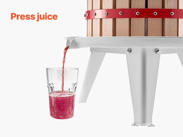 Efficiënt persen: Deze handmatige fruitwijnpers is voorzien van een dik beukenhouten persblok en acht steunblokken. Vergeleken met een traditionele stoffen pers zorgt de hogere druk voor een grondigere extractie en efficiënte, snelle sapafgifte. U kunt in slechts enkele minuten een vers en gezond kopje sap persen en genieten van een pure, natuurlijke fruitdrank.