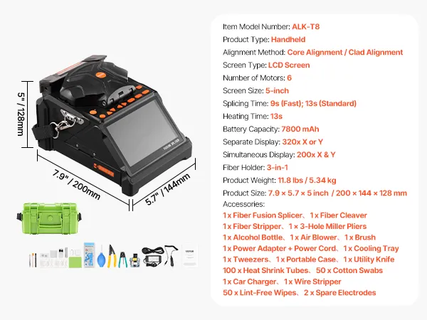 VEVOR Fiber Optic Fusion Splicer, 6 motoren, kern- en bekledingsuitlijning, met 6 seconden snelle splitsing en 13 seconden opwarmtijd, 5-inch LCD-scherm, 3-in-1 vezelhouder, 7800 mAh-batterij voor SM MM DS NZDS-vezels
