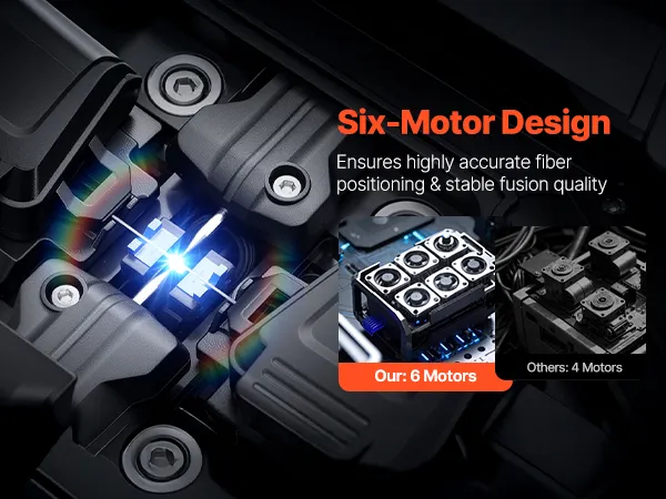 Our fiber optic splicer is equipped with 6 high-precision motors, ensuring highly accurate fiber positioning and stable fusion quality. Compared to standard 4-motor designs, our 6 motors deliver enhanced alignment accuracy, faster splicing speeds, and lower loss rates.