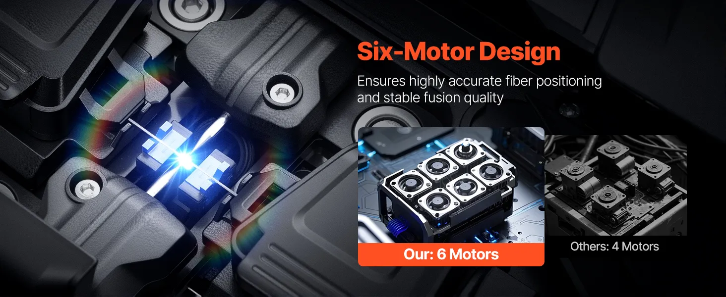 Fast Splicing & Heating: VEVOR fiber fusion splicer features 6 high-precision motors, advanced core and cladding alignment technology, enabling rapid 6s splicing, 13s standard splicing, and 13s fast heating, with a fusion loss as low as 0.01 dB (MM).