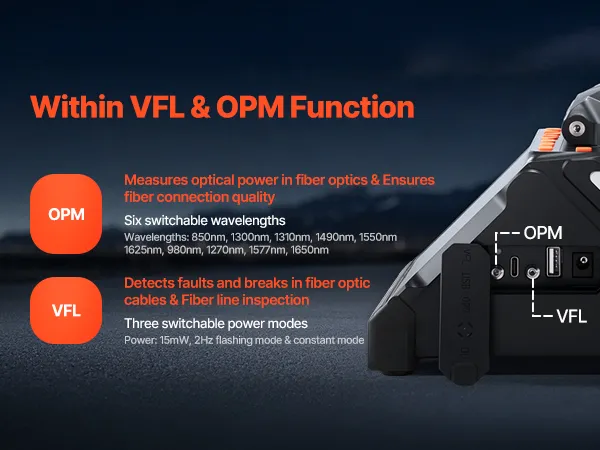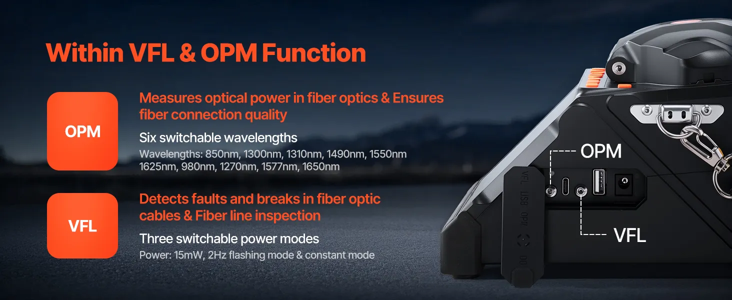 Our optical fusion splicer is equipped with VFL (Visual Fault Locator) for quick detection of fiber faults, breaks, and fiber line inspections. The OPM (Optical Power Meter) precisely measures optical power levels and ensures stable connection quality.