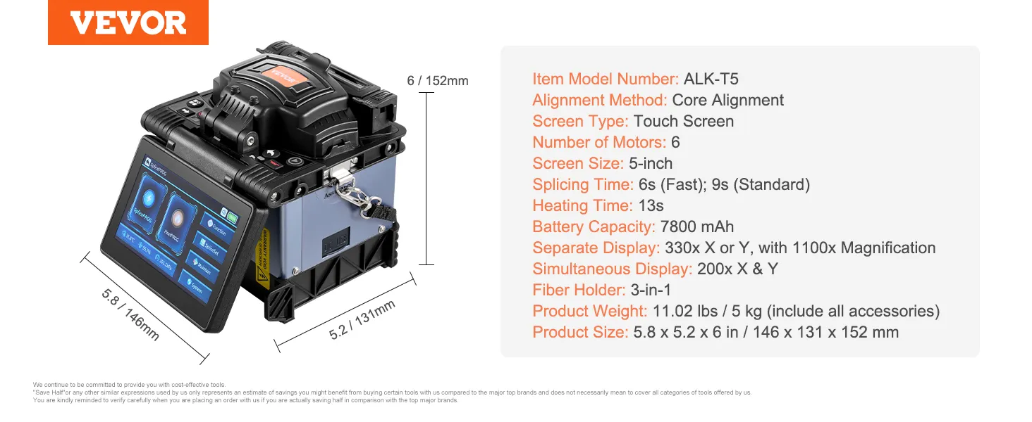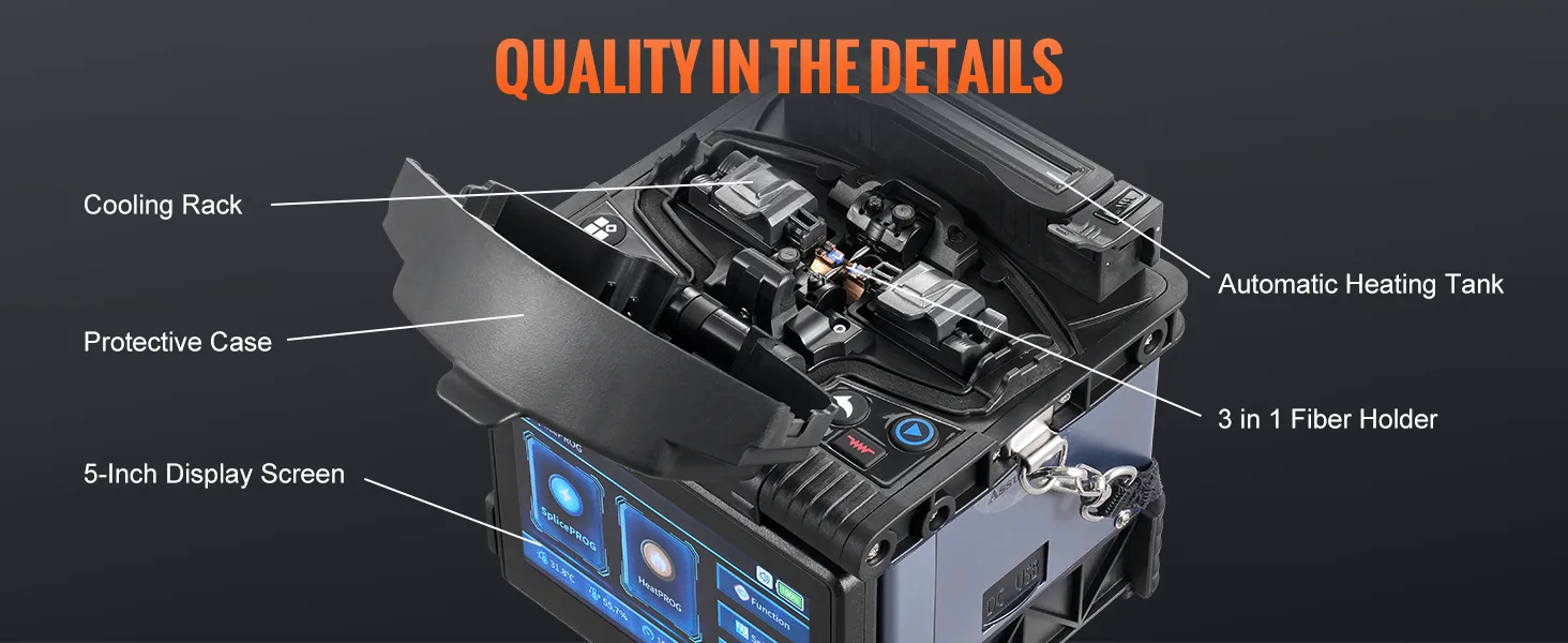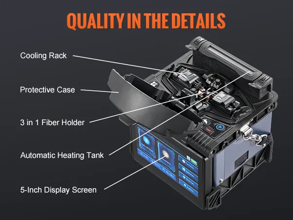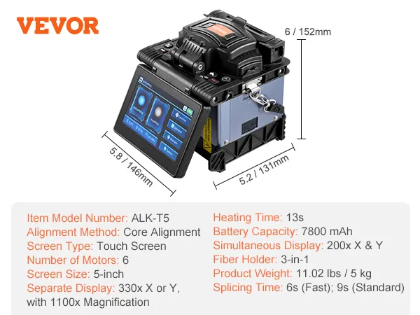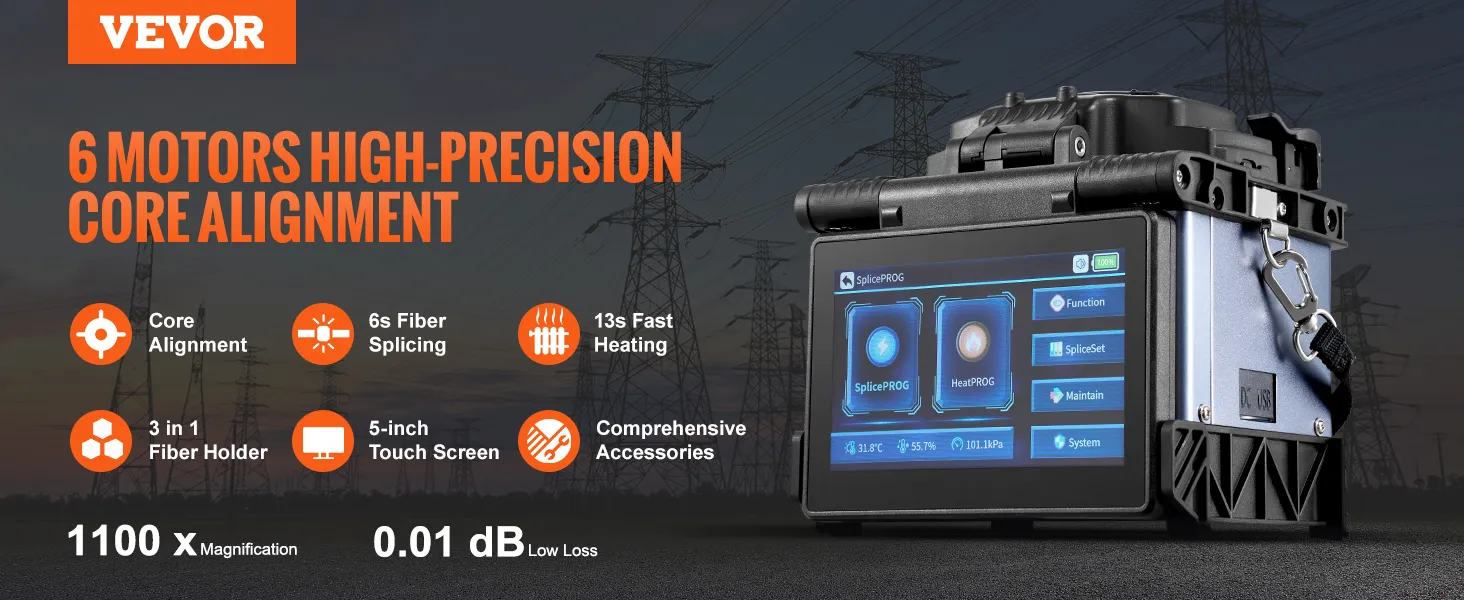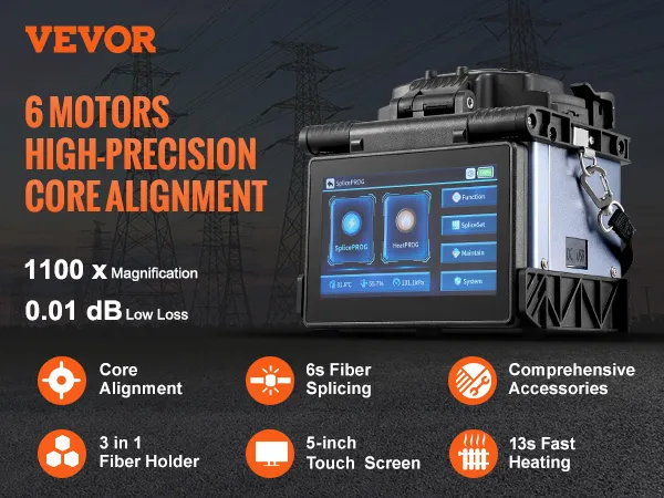 Uitgerust met kernuitlijningstechnologie, 6 uiterst nauwkeurige motoren en een 3-in-1 vezelhouder, zorgt de VEVOR-vezelfusielasmachine voor een snelle splitsing in slechts 6 seconden en een snelle verwarming in 13 seconden. Met een smeltverlies van slechts 0,01 dB levert hij helder en stabiele verbindingen.
