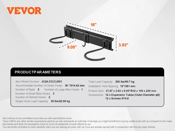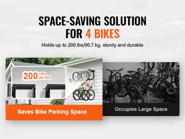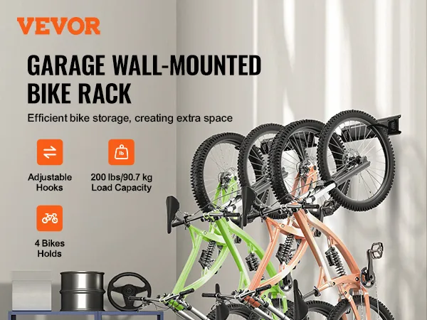 200 lbs/90.7 kg Strong Support: Engineered for durability, our steel garage bike rack's hooks each hold up to 50 lbs/22.68 kg, with a total capacity of 200 lbs/90.7 kg. Ideal for securely storing your bikes.