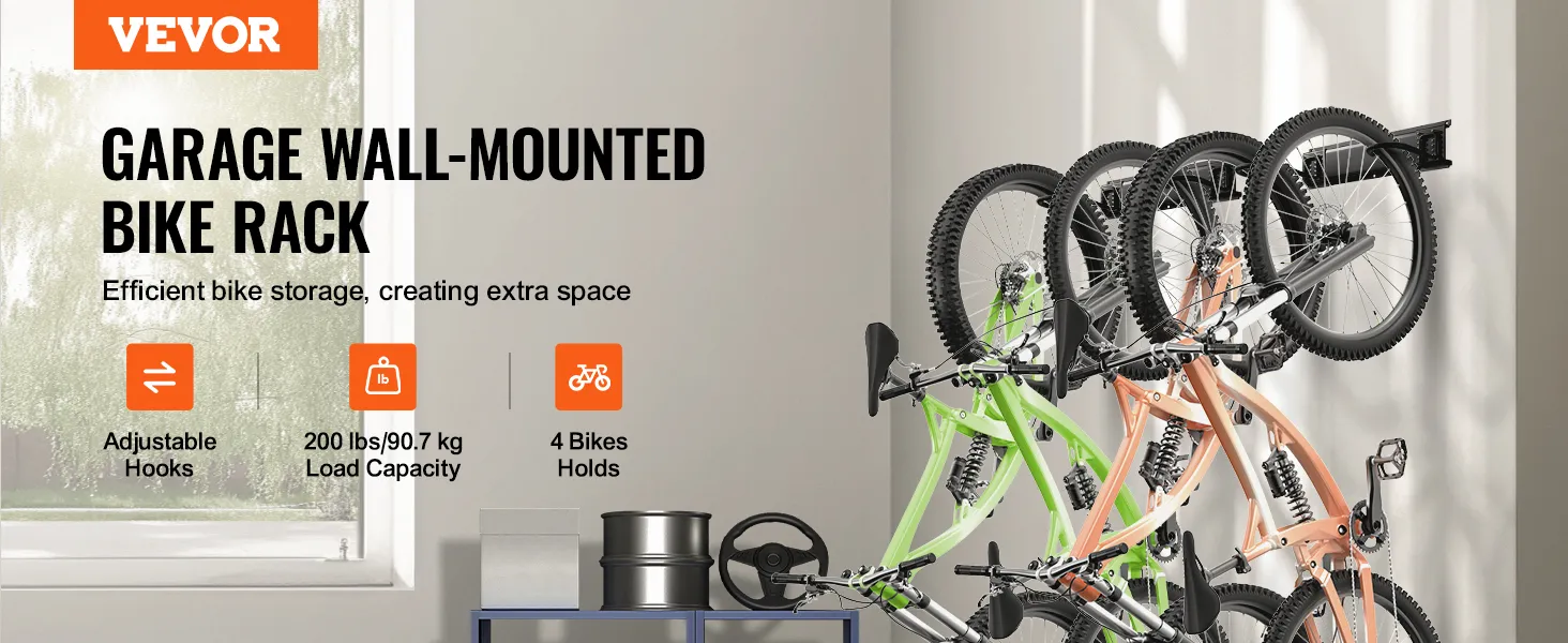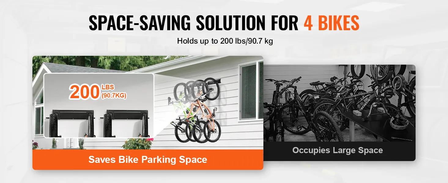 Maximize Your Space: Hang your bikes on the wall with our wall-mounted bike storage rack, designed with a 36 in/914.4 mm rail that supports 4 bicycles. Leave more floor space and enjoy a more spacious area for your activities.