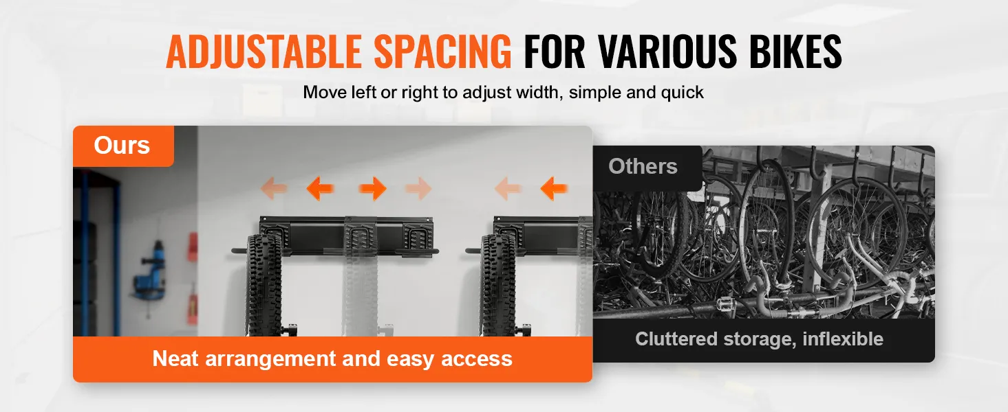 Adjustable Spacing: The bike wall rack's hooks are attached to the rail with a slot-and-slide mechanism, allowing the hooks to move laterally. This design lets you adjust the spacing between hooks to fit different bicycle types. Tailor the setup to your specific storage needs.