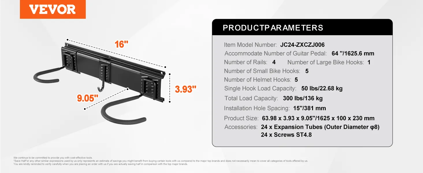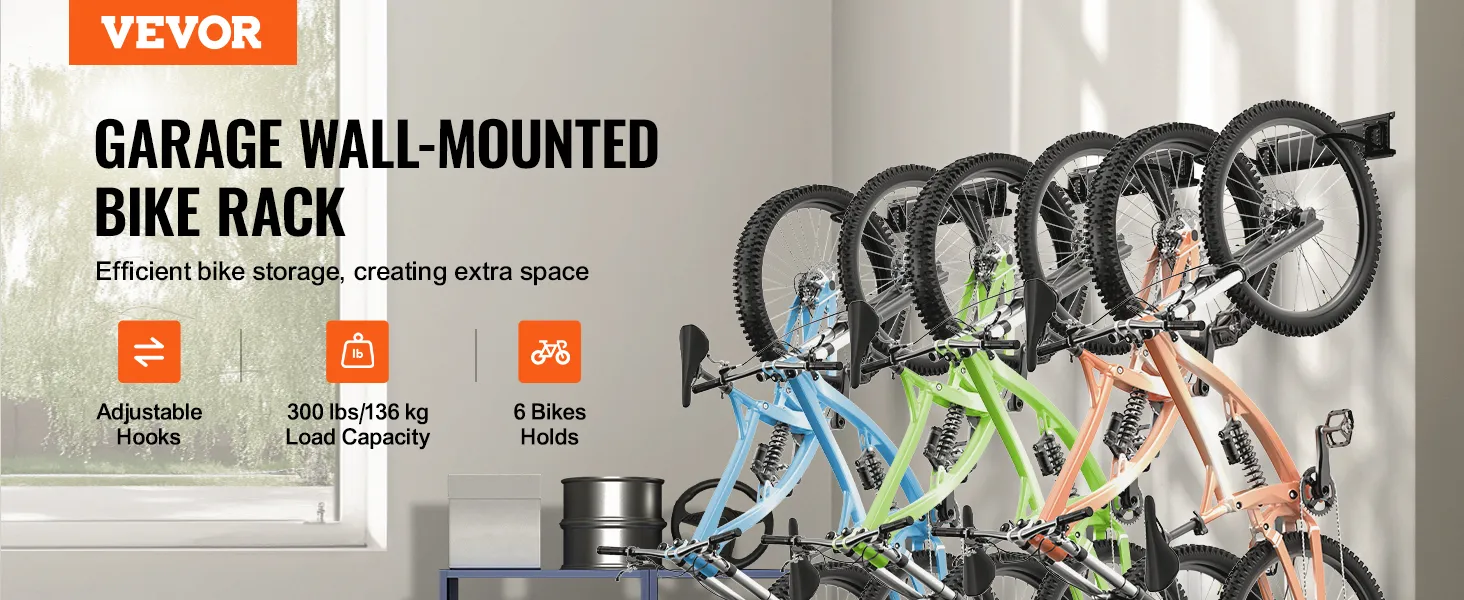 De duurzaamheid van deze VEVOR fietsenrek is gebouwd voor een lange levensduur. Het is gemaakt van hoogwaardig staal. Dit zorgt ervoor dat het tot 300 lbs kan dragen. Elke haak kan tot 50 pond dragen, wat betrouwbare ondersteuning biedt voor uw fietsen. De robuuste ondersteuning garandeert de veilige opslag van uw fietsen, waardoor het risico op ongelukken wordt verminderd. De sterke constructie maakt het geschikt voor langdurig gebruik, wat gemoedsrust geeft met betrekking tot veiligheid en beveiliging. U kunt uw waardevolle fietsen met vertrouwen opbergen, verzekerd van hun sterke ondersteuning. Daarom is het zo'n betrouwbare optie om uw fiets veilig en georganiseerd te houden.